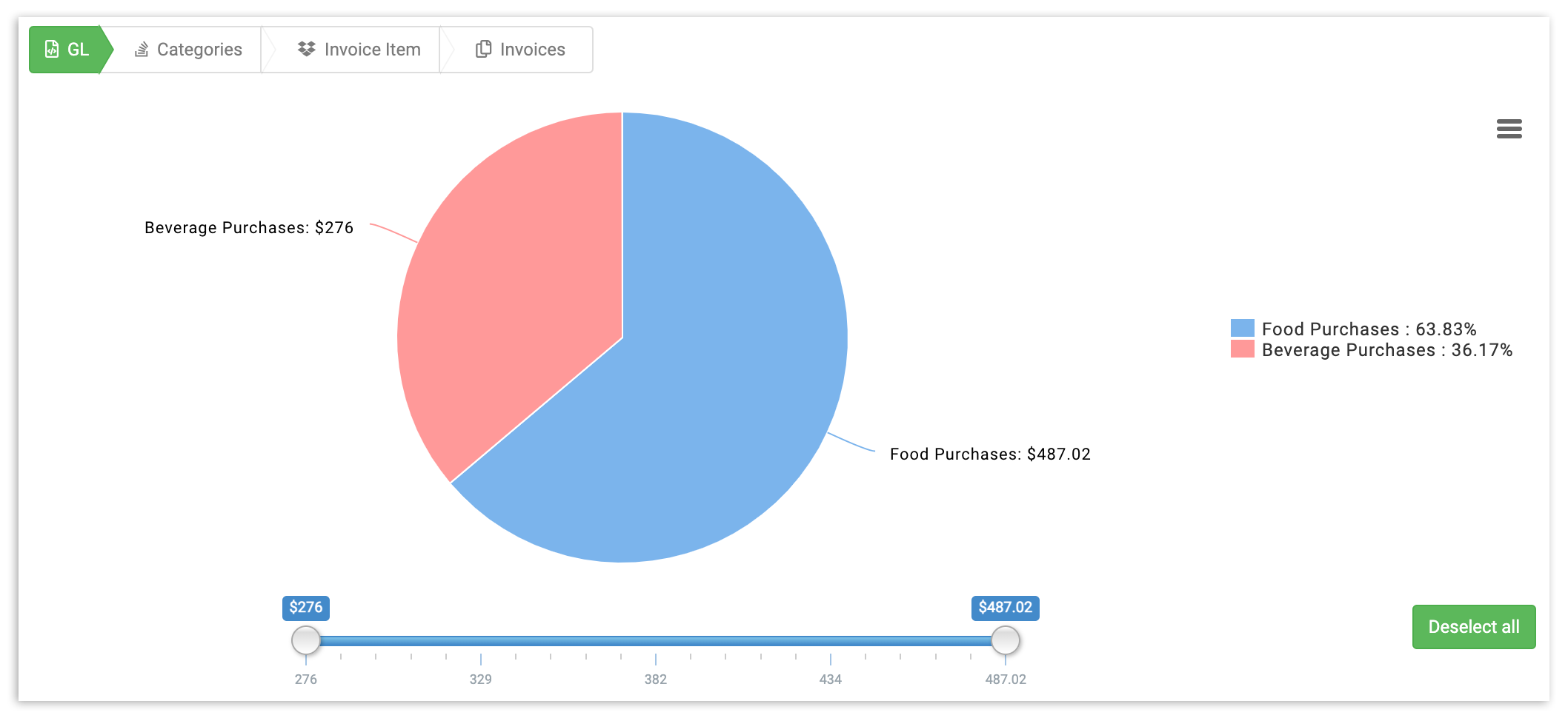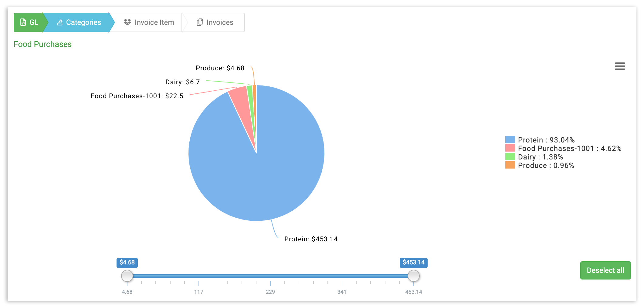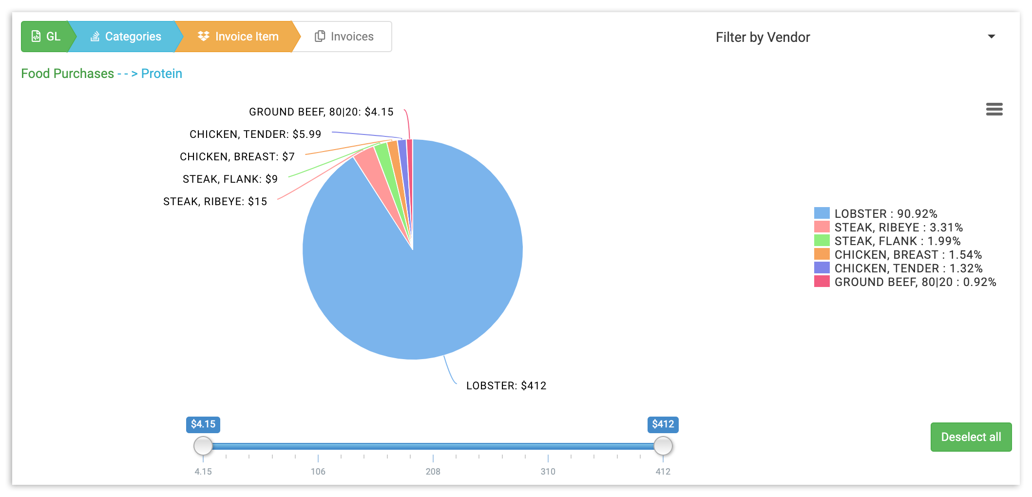 As in the other views, you can specify the exact categories and price(s) you want to see by either selecting the invoice item (or choosing Deselect All) to the right of the pie chart, or by adjusting the price slider underneath it.