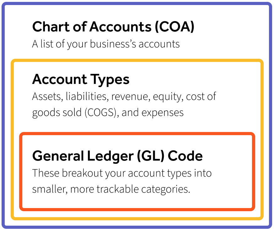 Typically, a COA is broken out by account types such as assets, liabilities, revenue, equity, cost of goods sold (COGS), and expenses. Those account types may then be split into even more specific groups, commonly referred to as general ledger codes (GL Codes).