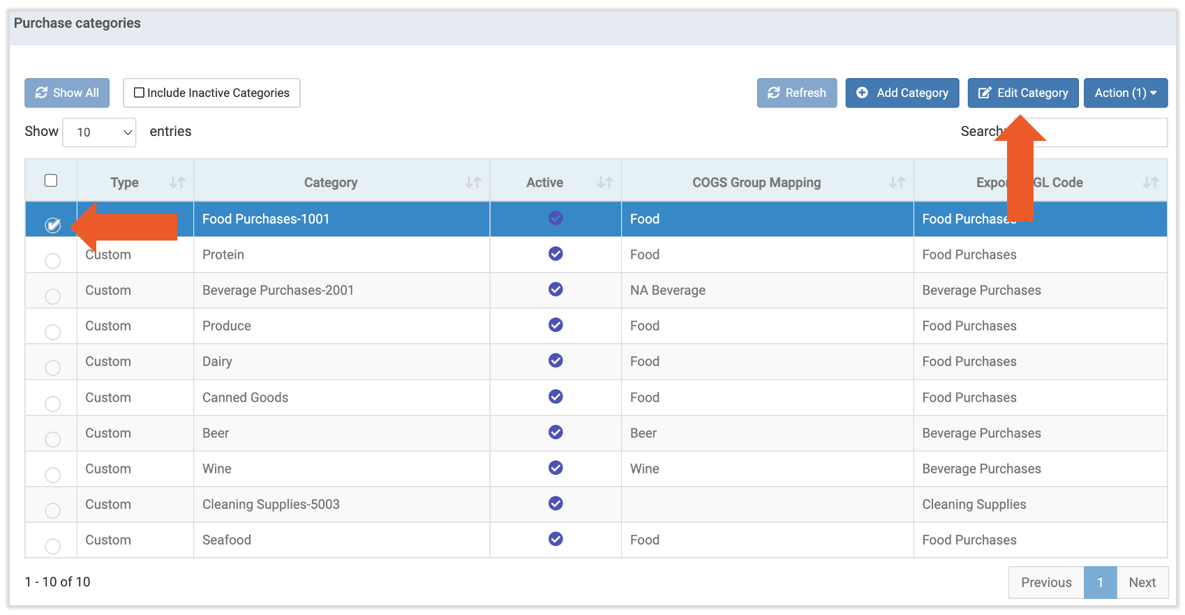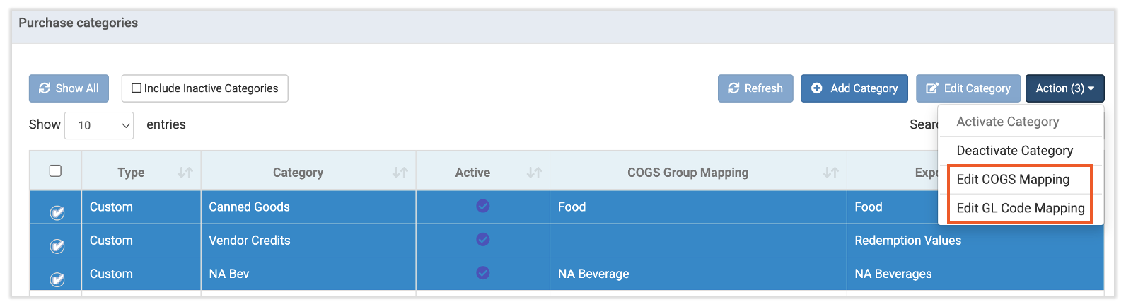 You can easily update multiple purchase categories at once. First, select the checkbox for each purchase category you want to include. Then select Action and select either Edit COGS Mapping or Edit GL Code Mapping. Once you've selected your intended COGS Group or GL Code, select Save.