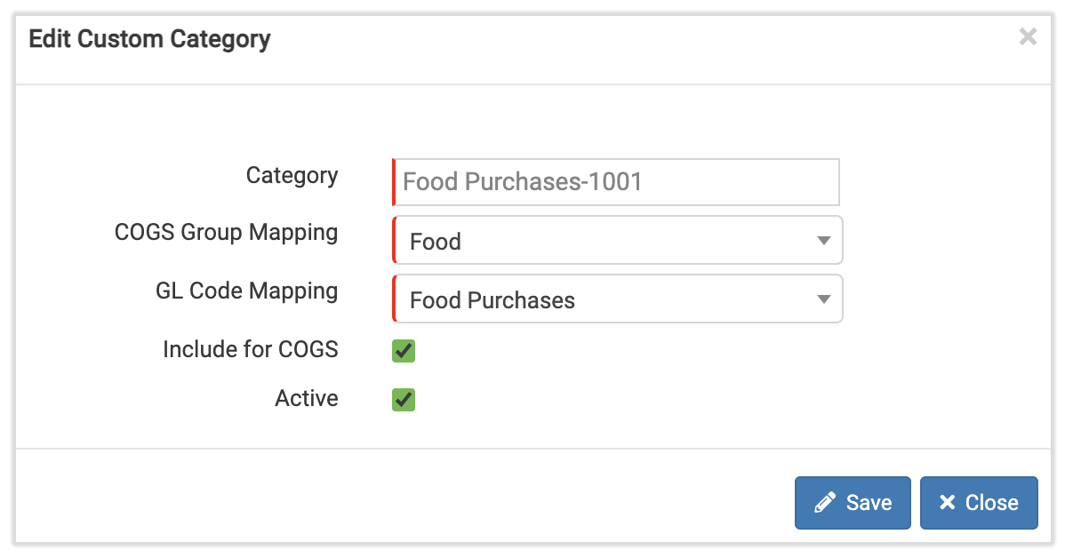 Here, you can make changes to the purchase category's associated COGS Group Mapping or GL Code Mapping. Remove the COGS group mapping by selecting the drop-down, choosing Select, and unchecking the box for Include for COGS. You can also make an active purchase category inactive by unselecting the Active box. Select Save when you're done and your changes will immediately take effect.