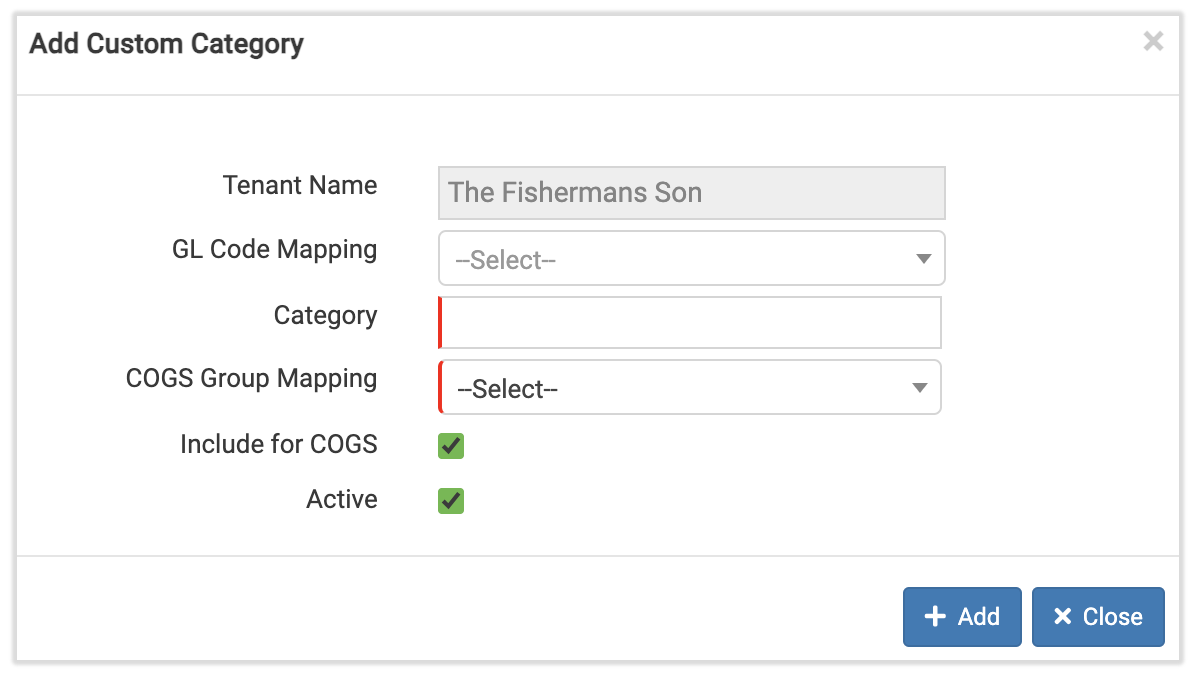 Name this new purchase category and select the GL Code Mapping and COGS Group Mapping you wish the purchase category to break out from. Select Include for COGS if you wish to map your COGS Groups to purchases. Visit to learn more about COGS mapping. Finally, select +Add to lock in your new purchase category.