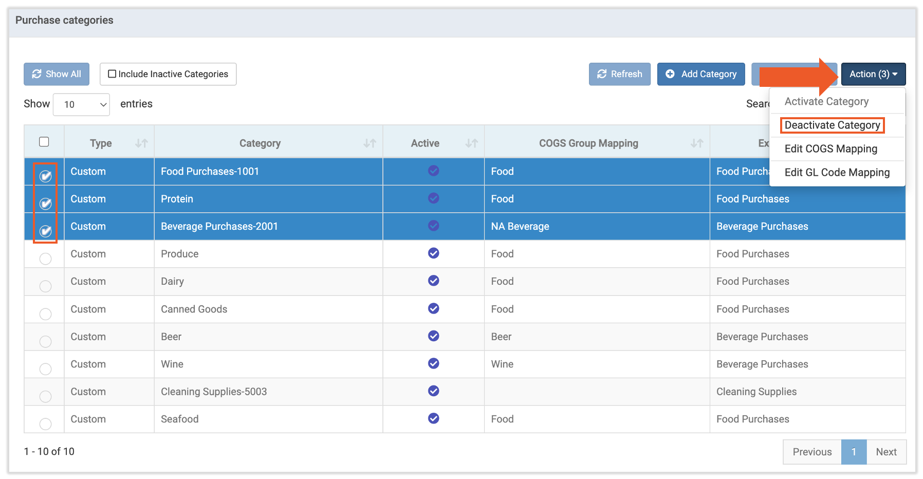 If you wish to deactivate or activate purchase categories, you can do so individually or in bulk. Navigate to the gear icon > Purchase Categories. Now select the checkbox for each purchase category you'd like to manage. Next, select Action > Deactivate Category.