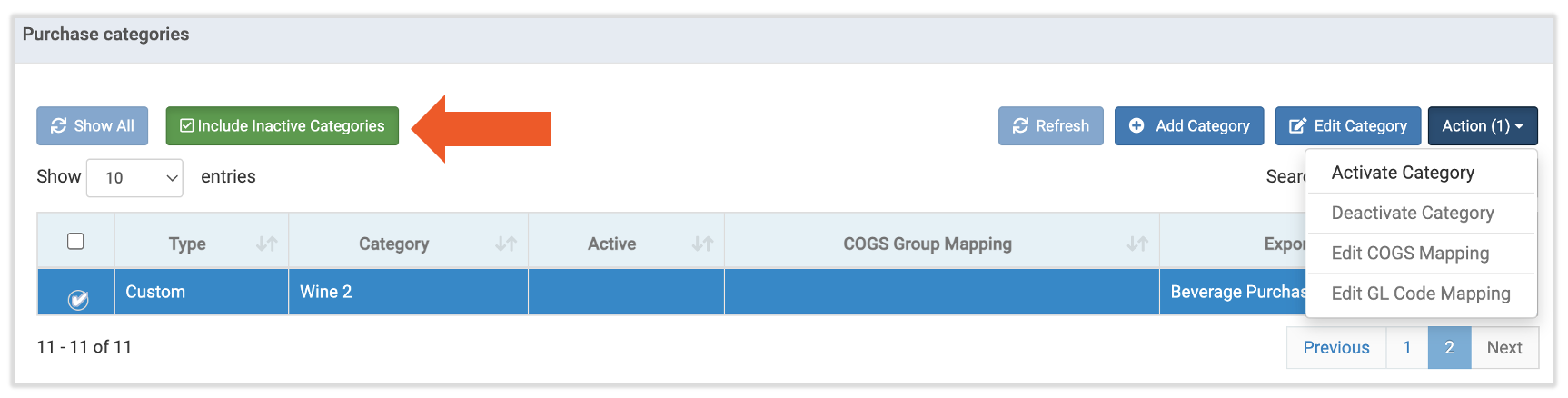 By default, inactive purchase categories do not appear on this page unless Include Inactive Categories is selected. Once this filter is enabled, follow the steps above to select the purchase category's checkbox and navigate to Action > Activate Category. Note: Inactive purchase categories can still be viewed, but items can no longer be assigned.