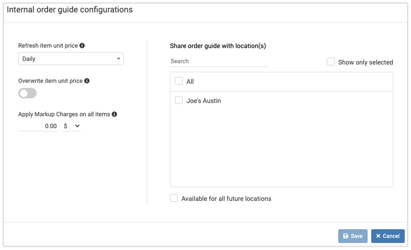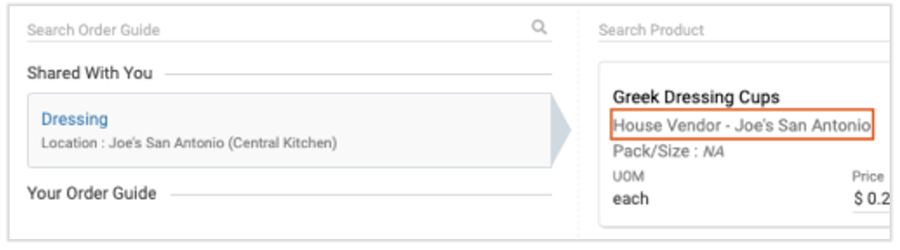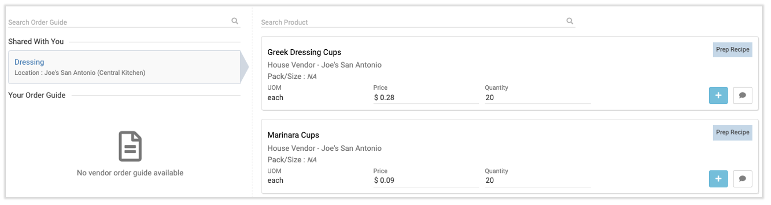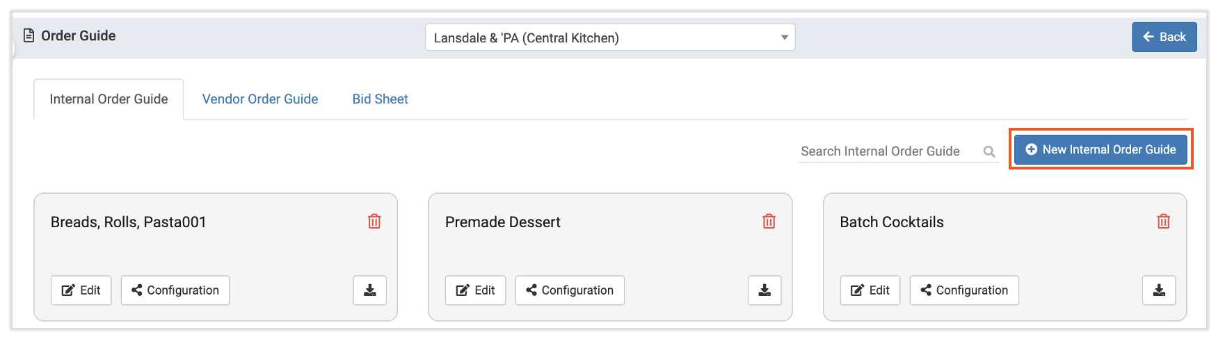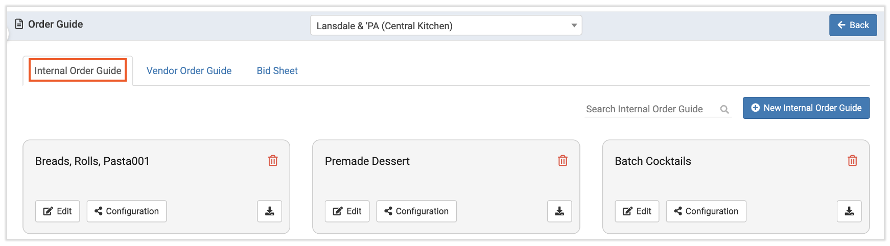 Internal order guides are similar to the order guides you already use for vendors. However, internal order guides allow different locations to send orders right to your central kitchen location.