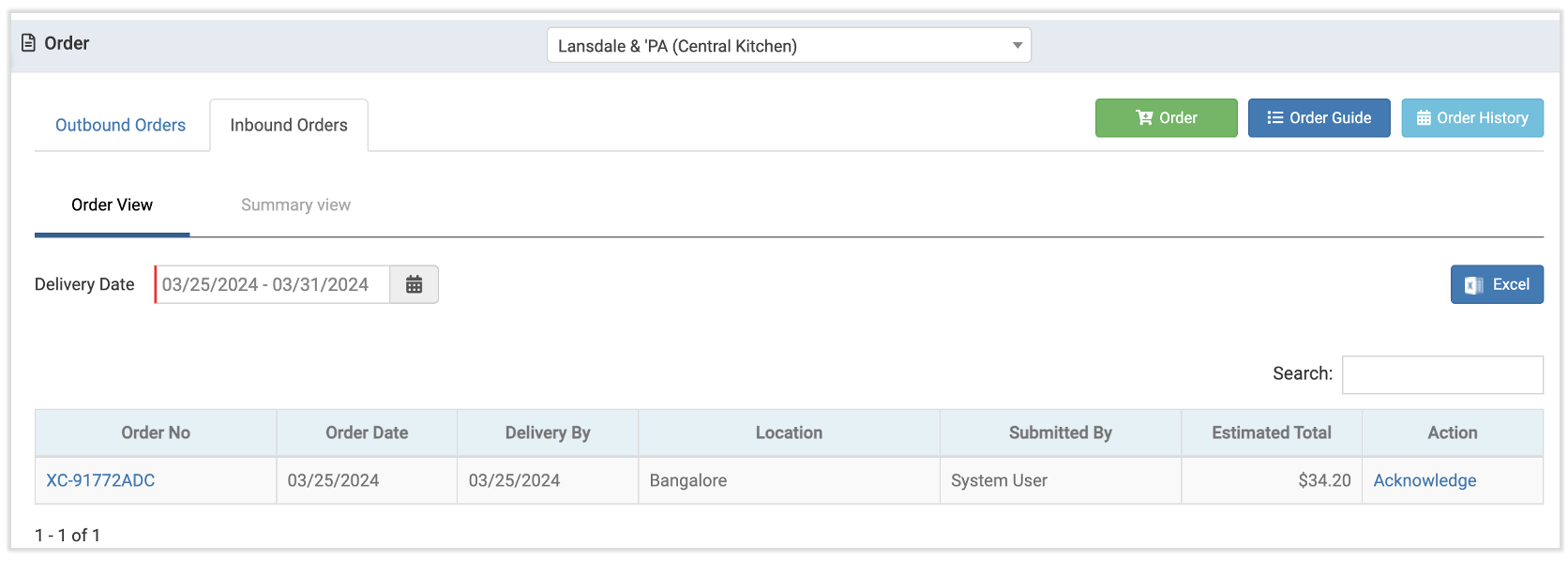To view or fulfill an inbound order, navigate to the Order page and select your central kitchen location. In addition to the Outbound Orders tab all locations have, central kitchen locations also have an Inbound Orders tab. This is where all internal order requests for the central kitchen are located.
