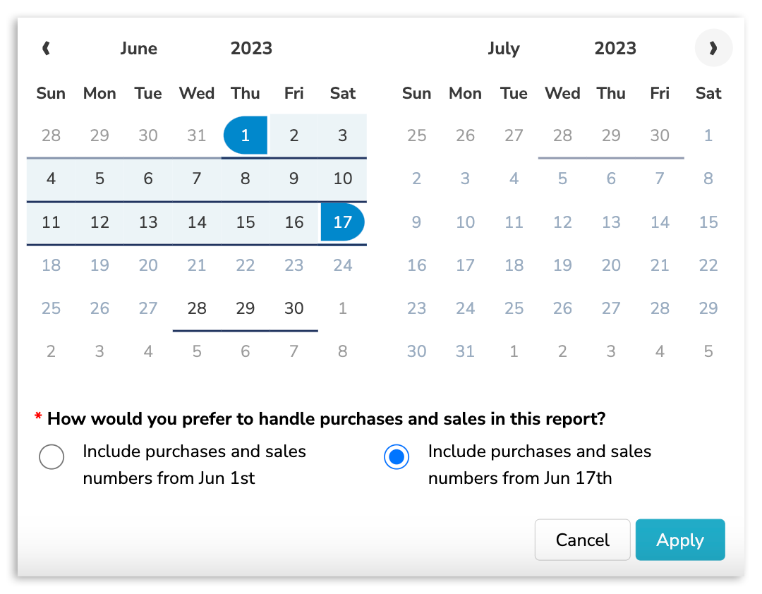 Upon selecting your date range, you will be prompted with 'How would you prefer to handle purchases and sales in this report?' To proceed, select either Include purchases and sales numbers from x start date or Include purchases and sales numbers from x end date.