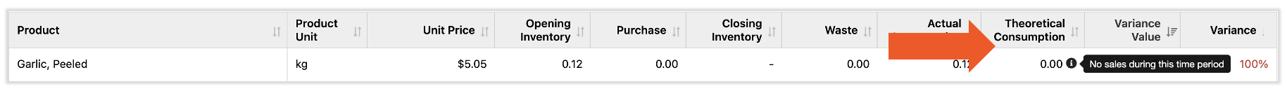 Your wastage indicates the cost or quantity of an ingredient that has been logged as waste. This can be done via the Manage Waste function in the Inventory module. Logging waste allows you to separate avoidable incidents such as breakage and ingredient spoiling from your variance.