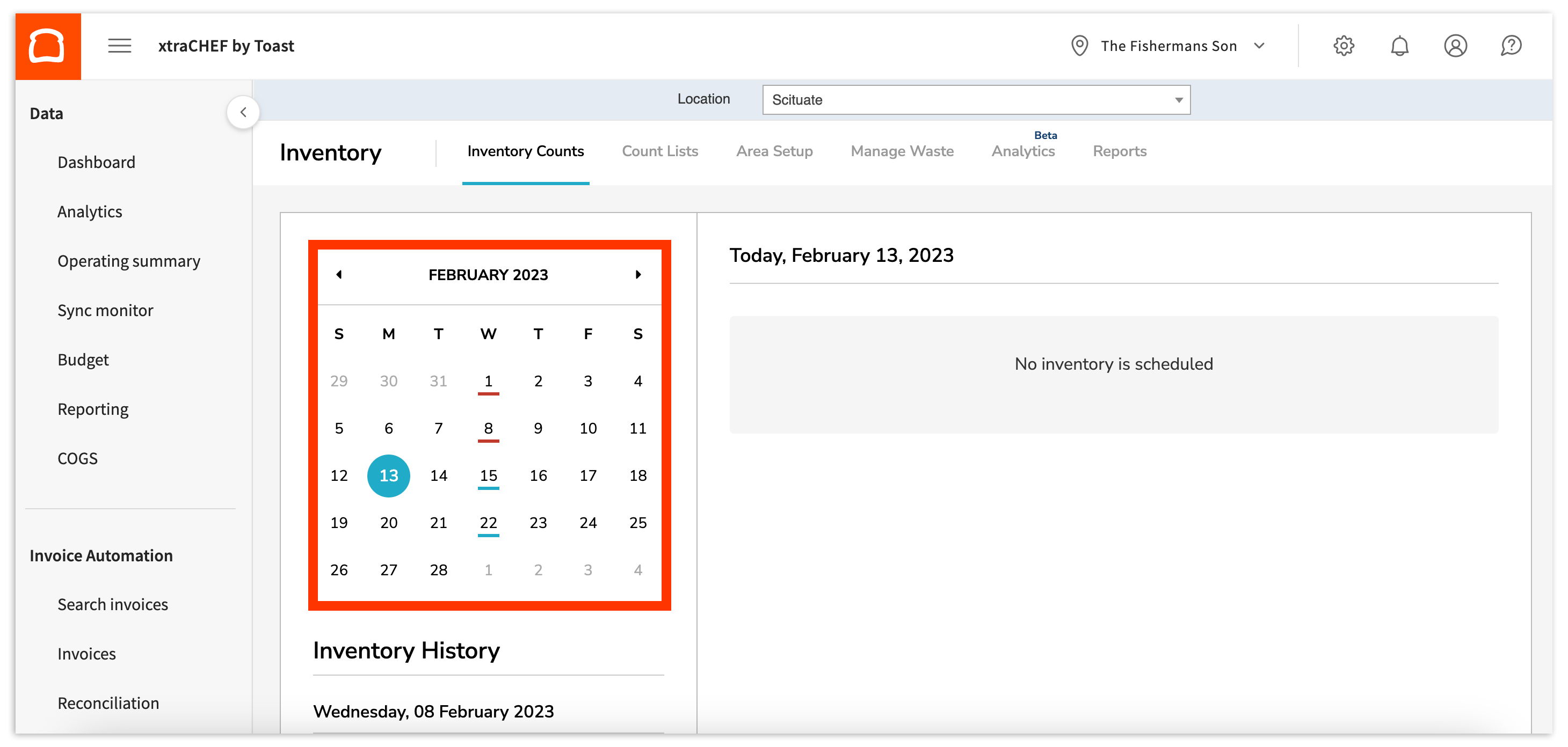 To complete a scheduled inventory count, navigate to your Inventory tab. By default, you will land on the Inventory Counts tab. Here, you will see a calendar on your left side showcasing the month's overdue and upcoming inventory counts. You will also see any inventory counts that are scheduled for today. If no Inventory Counts are scheduled, you will see a 'No inventory is scheduled' message. You can complete previous or preview future, inventory counts by selecting dates on the calendar.