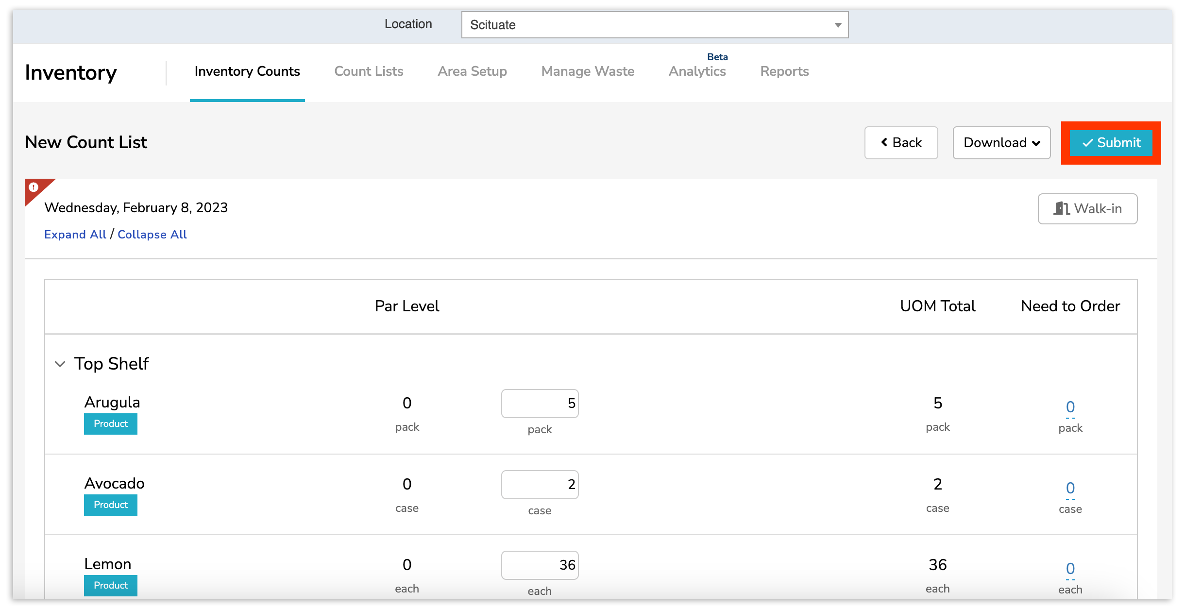 When you've completed your inventory count, select Submit near the top right corner.