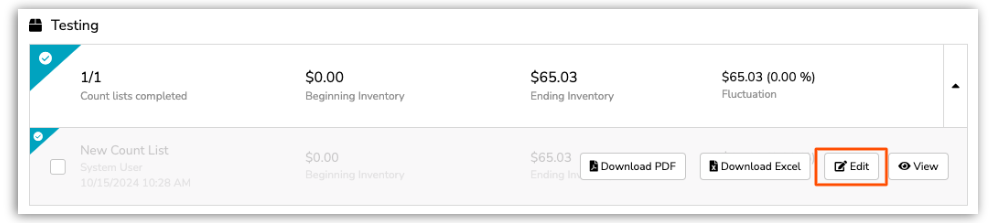Missed an item or two? No worries. You can always edit a previously completed Inventory Count. To do this, revisit the date this Inventory Count was completed. Then, select the arrow dropdown next to the count to reveal the Edit option, which allows you to adjust your inventory counts while reflecting pricing and values as they were on the day of the original count completion.