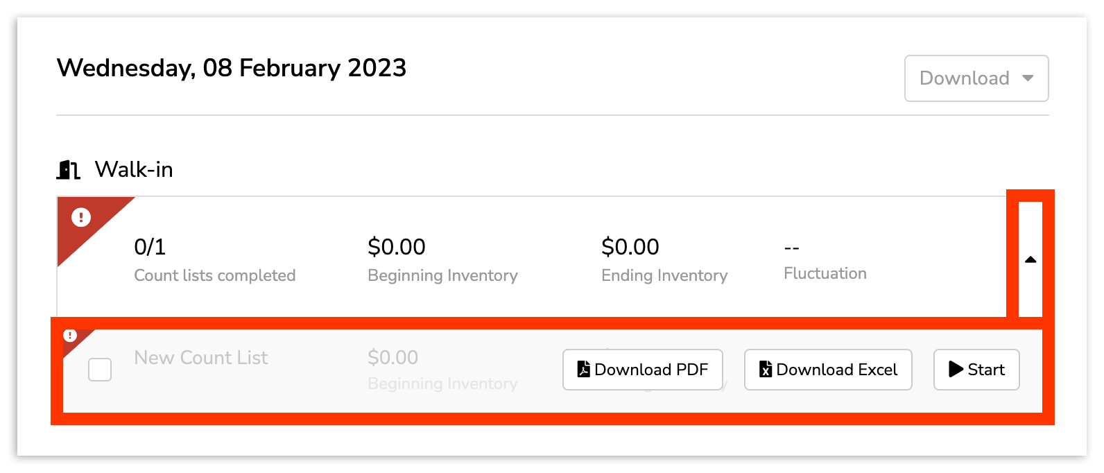 To start the inventory count, select the down arrow on the count you want to begin. Then select + Add New Inventory to open the inventory count. To begin entering inventory levels, select the down arrow. This time, select Start.