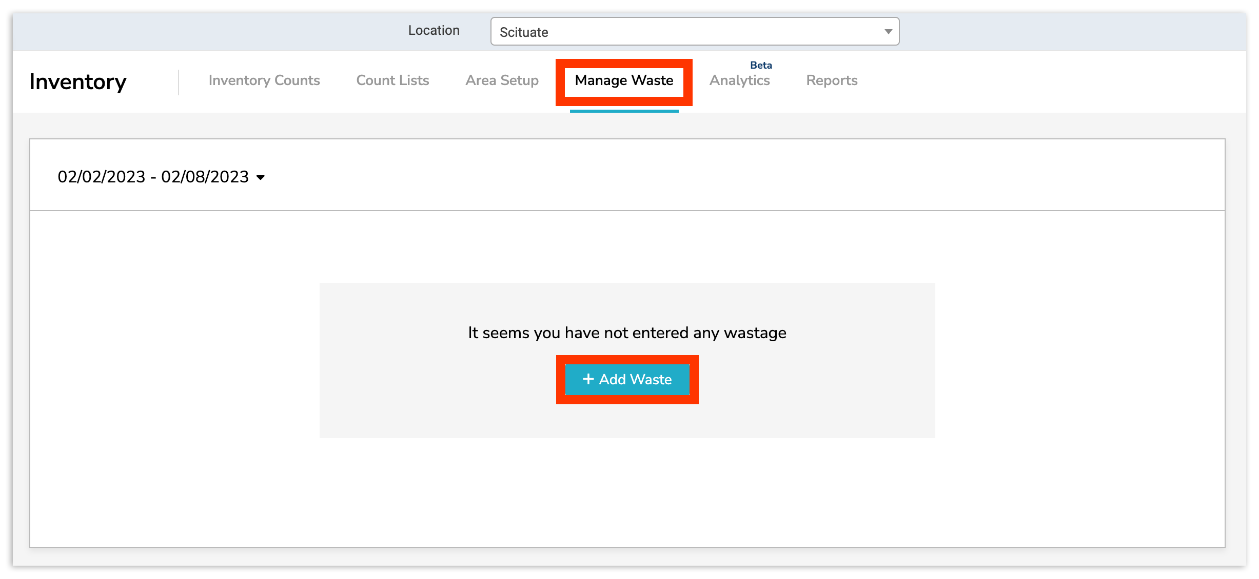 To access the Manage Waste feature, select Inventory > Manage Waste. Select + Add Waste to begin logging a new waste entry.