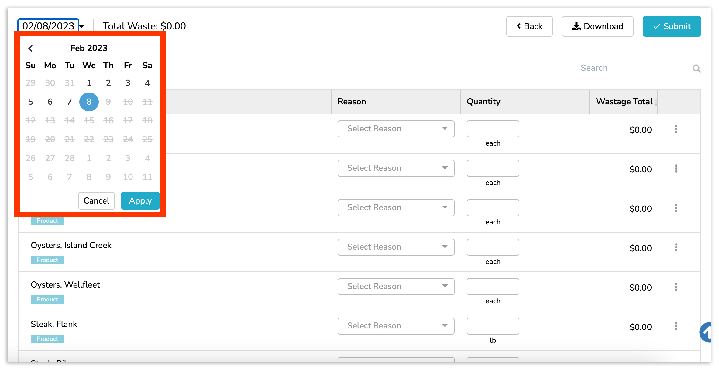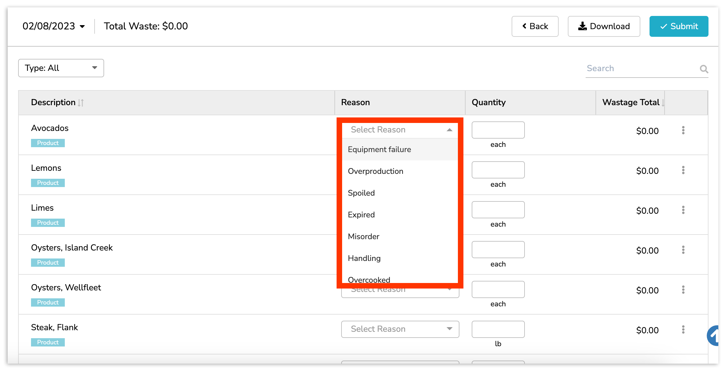 You can indicate reasons and quantities for multiple inventory items at a time. Then, when finished, select Submit near the top right of your page. Immediately after selecting Submit, you will be presented with the completed waste log for the day.