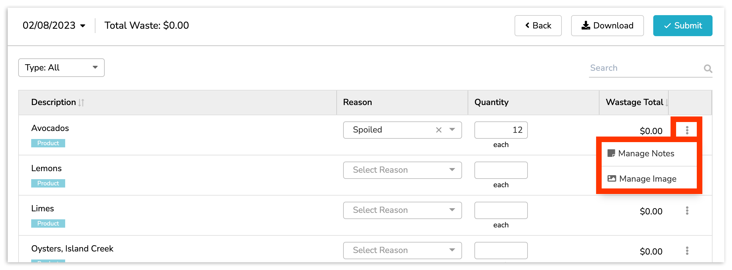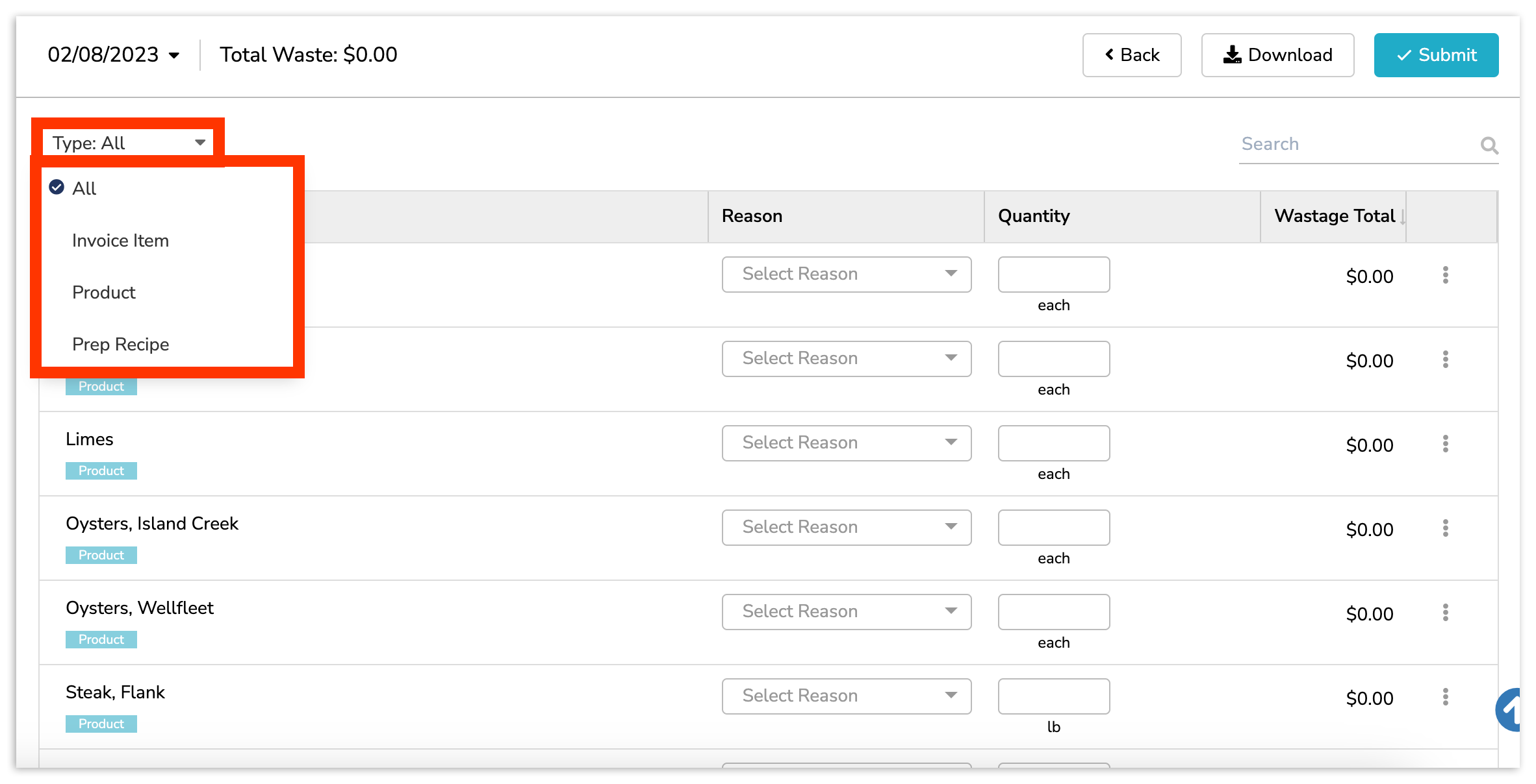 With your date chosen, find and select the inventory item or ingredient that has been wasted. To narrow down on a particular ingredient, you can Search or select a Type. Best practices call for logging waste by Product. Doing so will ensure accuracy in Inventory Analytics. For more on products, visit .