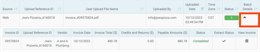 The Invoice Detail tab provides valuable data on when your invoice was uploaded, who uploaded it, and whether it has been processed (green) or is still in the processing stage (yellow). Even more, information can quickly be revealed by selecting the ^ icon under Batch Details.