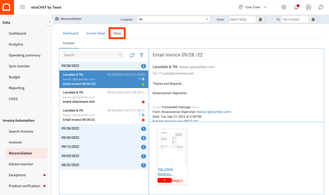 Note: Only emails from a registered user in your xtraCHEF account with a PDF file invoice will be accepted.