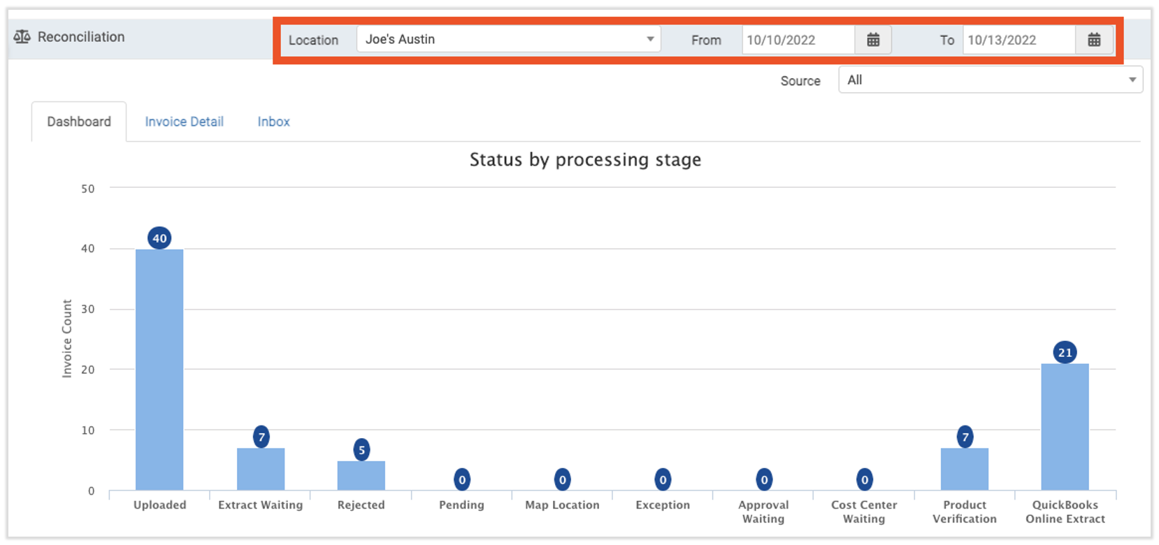 Once selected, the status of all your invoices from the current week will populate in a bar graph. You're able to set specific parameters for reconciliation by selecting a different location, a new date range, or filtering by uploading source.