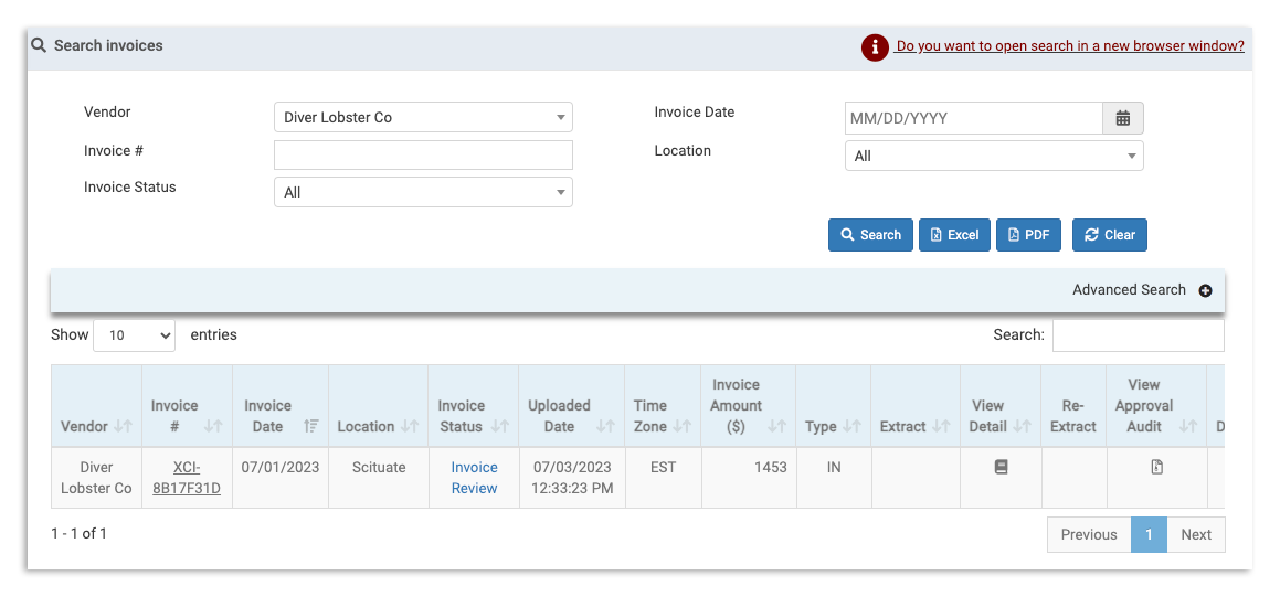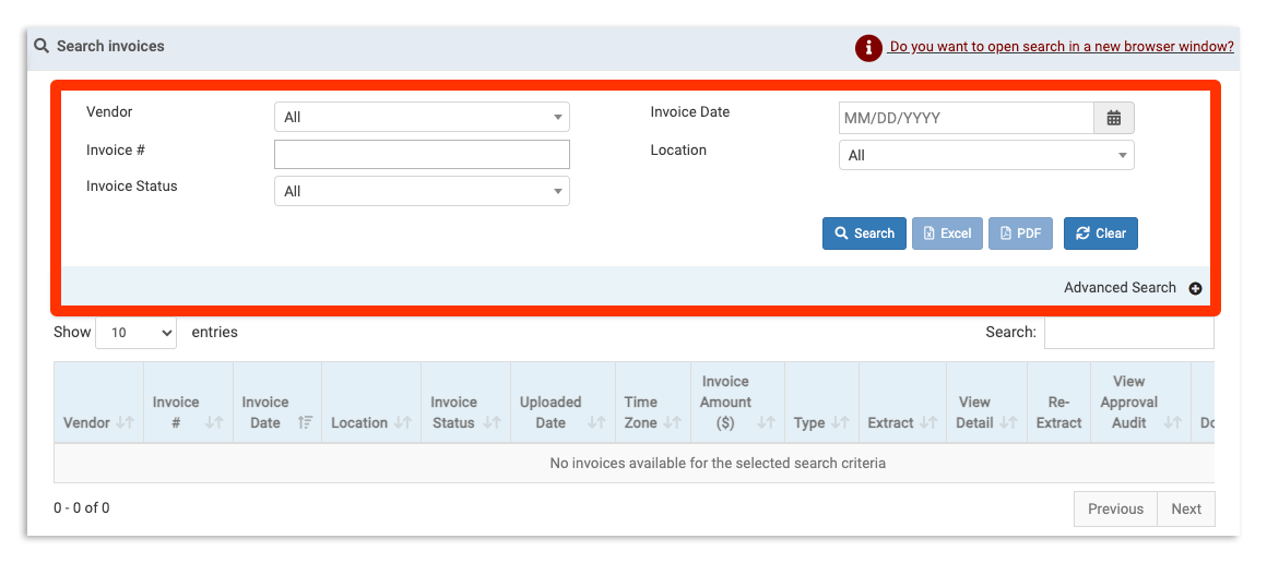 By default, you'll be directed to the basic search. Basic search allows you to find invoices by vendor name, invoice number, invoice date, invoice status, or location.