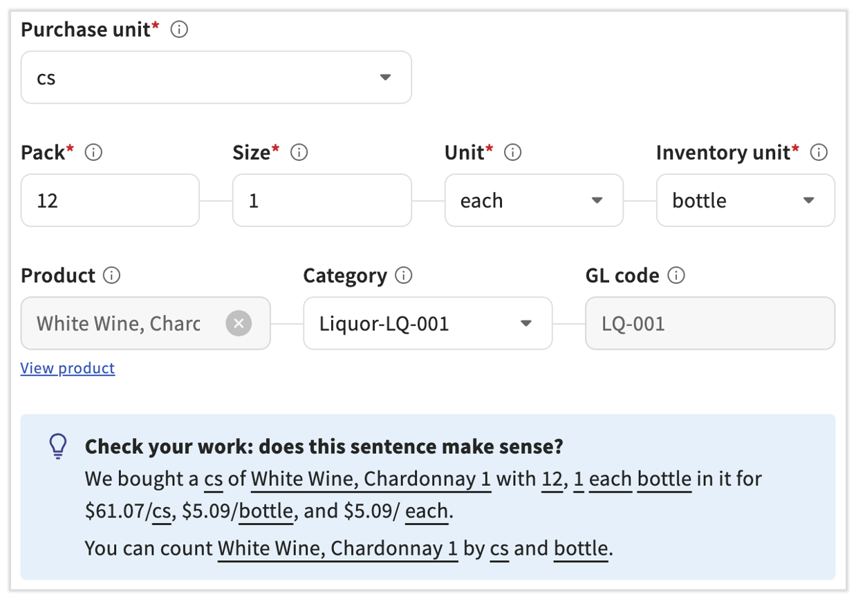 | Inventory unit (Item UOM) | This is only required when the pack value is more than 1. This is where you’ll name the packs in the case. Continuing the example from above, this would be ‘bottle.’ If Inventory unit is not defined and a pack is more than 1, then the system will default a value to 'each.’ |