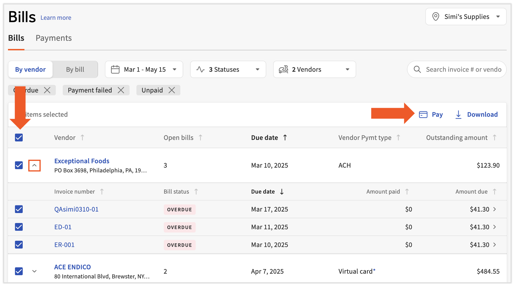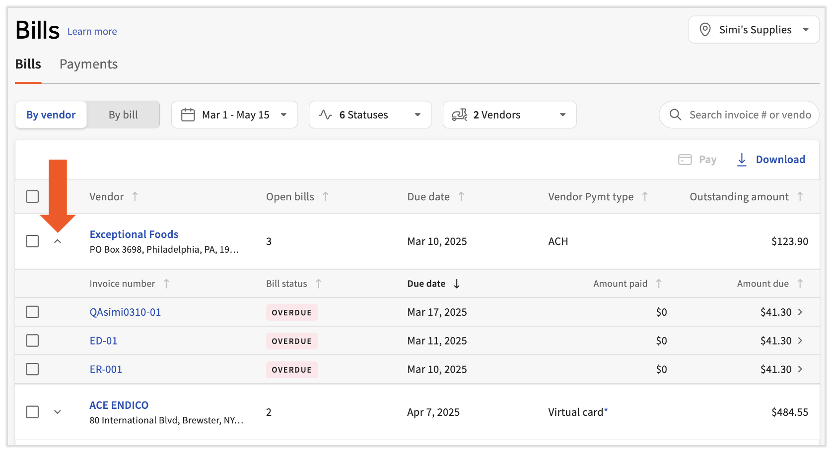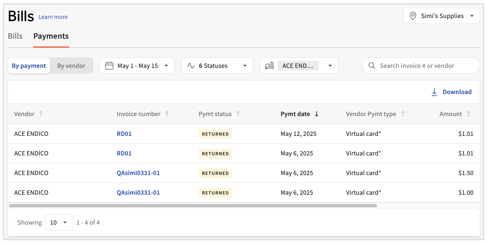After paying your bills, you can find a record of these payments by navigating to Bills > Payment. The same filters appear on this tab, so filter your data if necessary. There are different payment statuses (Pymt status) that appear for each bill: