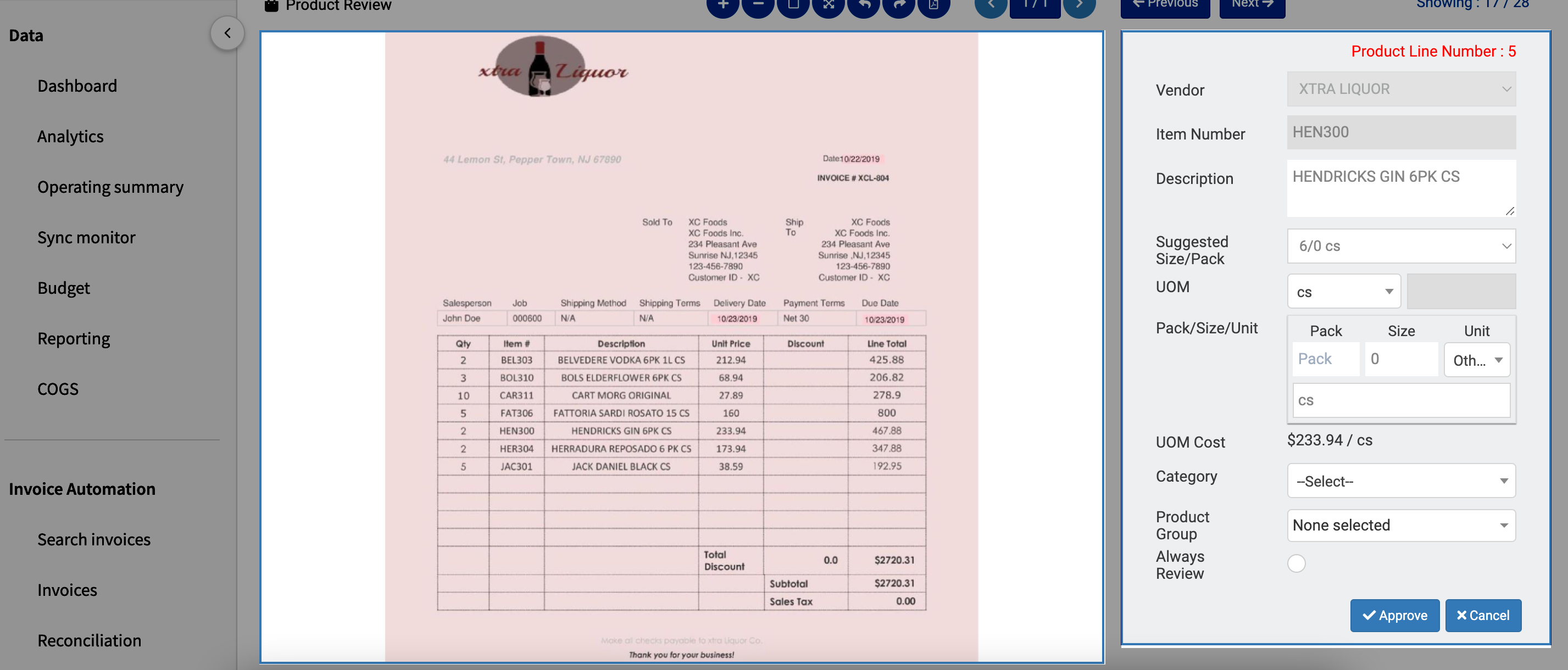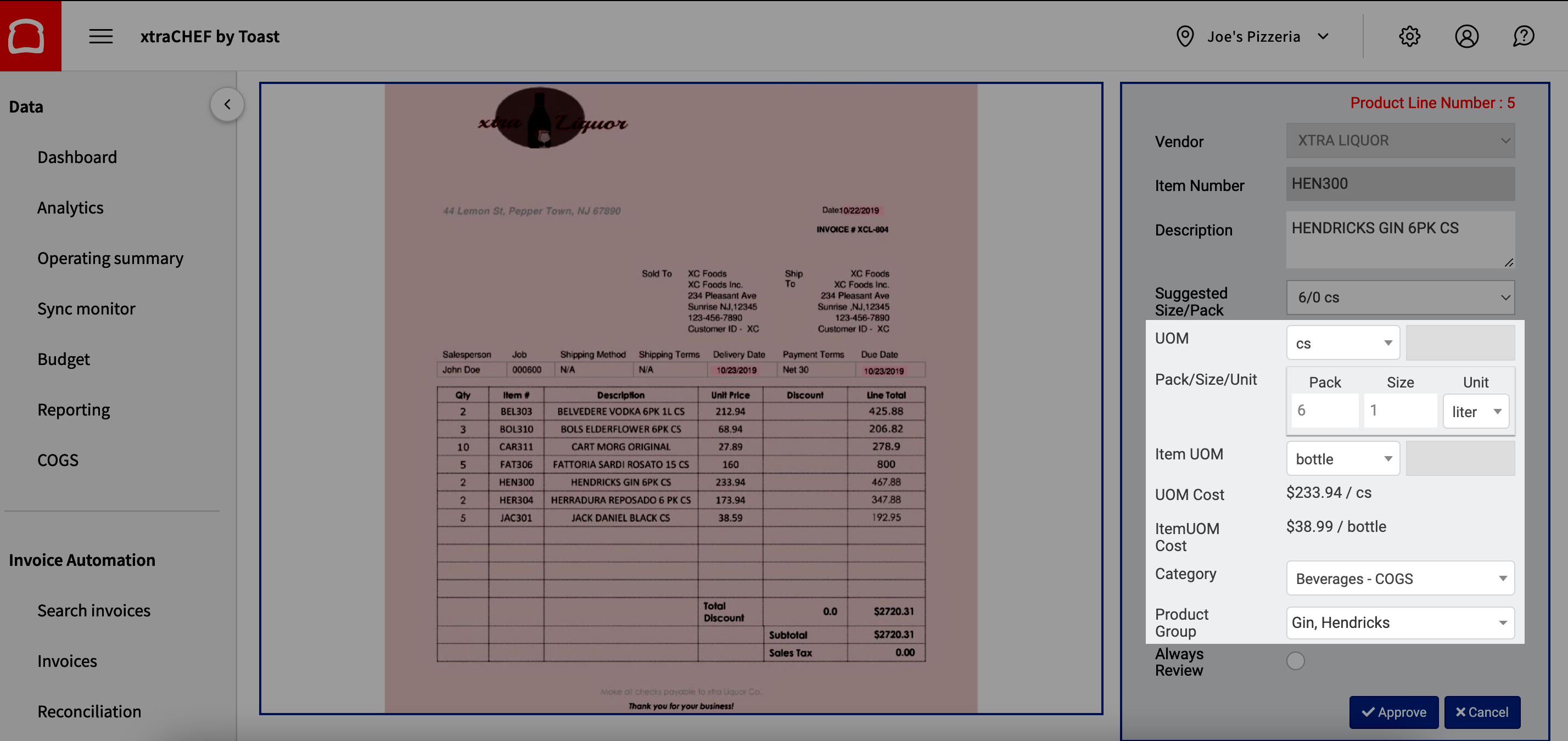 xtraCHEF will then prompt you to verify specific invoice item details. These details will be vital later on when xtraCHEF begins to calculate your prime costs and inventory values. For quick reference, the originally uploaded invoice will populate alongside the product detail fields. xtraCHEF will also indicate the line number it is prompting you to cross-reference on the invoice.