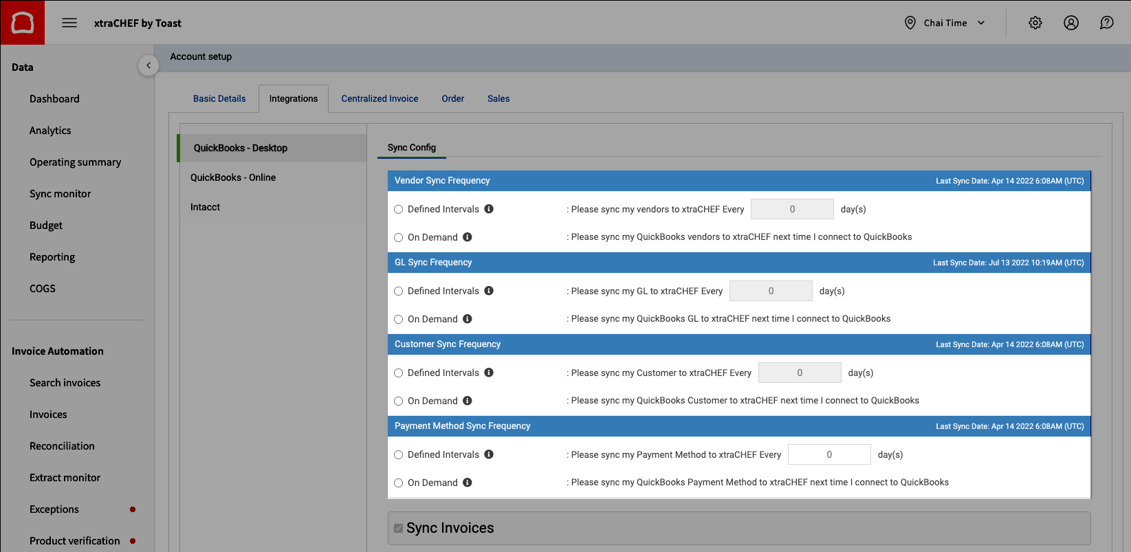 You can establish a sync frequency for each of these categories depending on your preference and how often you intend to run extracts. By choosing to sync At Defined Intervals, you're setting the frequency in which xtraCHEF can sync with your QuickBooks Desktop file. In comparison, Syncing On-Demand would require you to initiate a sync in xtraCHEF manually.