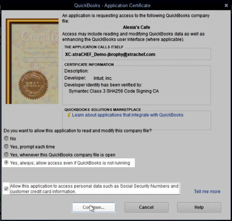Upon selecting OK, another pop-up will appear. You can choose from any of the last three options based on your preference. However, we typically recommend choosing the last option: Yes, always; allow access even if QuickBooks is not running. Next, verify that you would like to allow this application access to your QuickBooks data. Select Continue once you have made a selection.