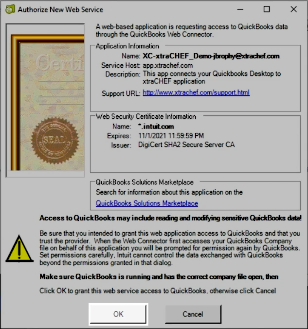Next, you will see a pop-up asking for your permission to allow access xtraCHEF access to your QuickBooks data. To proceed, select OK.