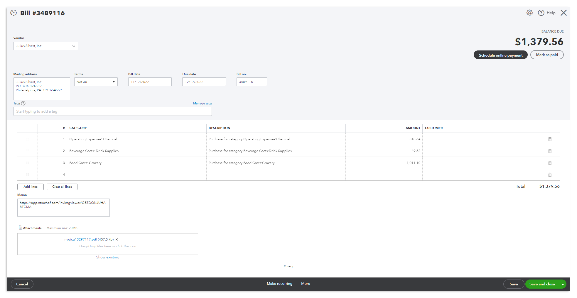 Invoice Syncs will include vital Invoice information such as an original invoice scan/photograph, general ledger information, vendor information, and more. The visual below represents how this sync will appear in your QuickBooks Online Account.