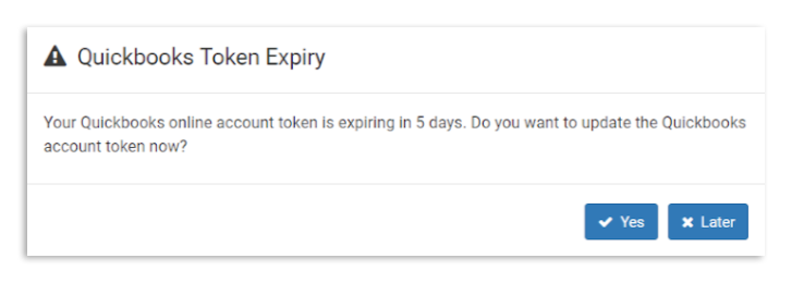 Eight days before your token expires, you'll begin seeing a pop-up reminding you to update your permissions settings. This pop-up will appear every day until you re-authenticate with QuickBooks Online or until the token expires.