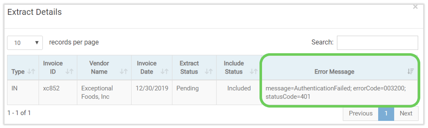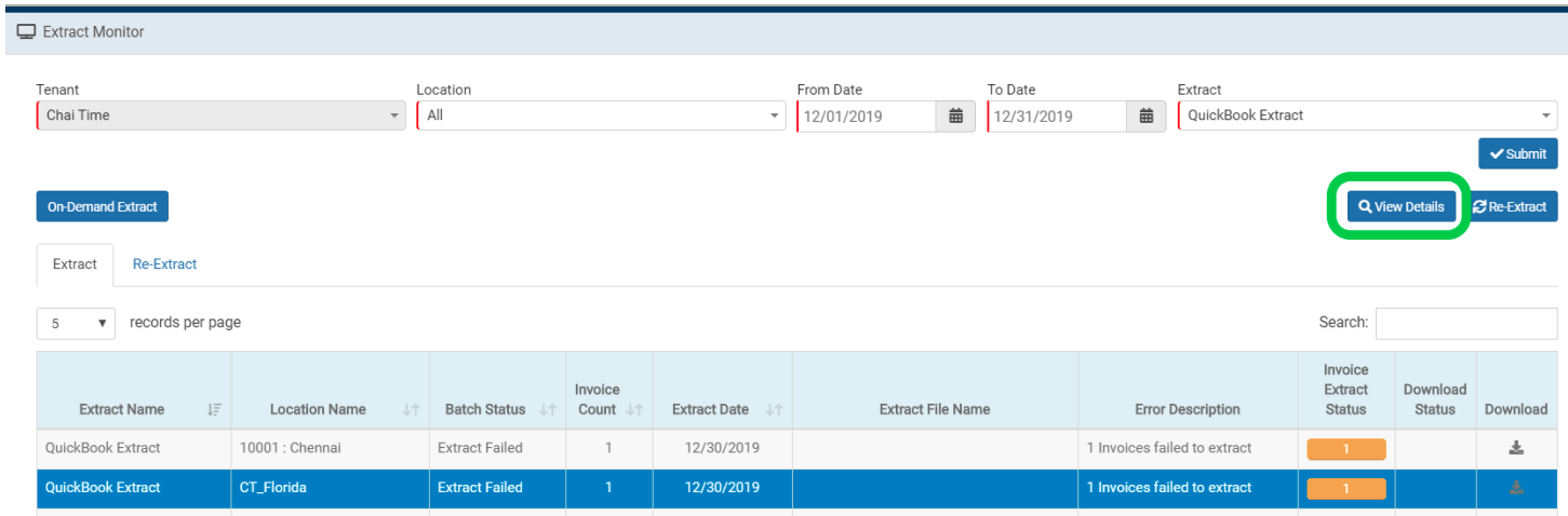 To determine if an extract was successfully imported into QuickBooks, review the Extract Monitor. For any Invoice Extract Status that is not green, select View Details for that specific file.