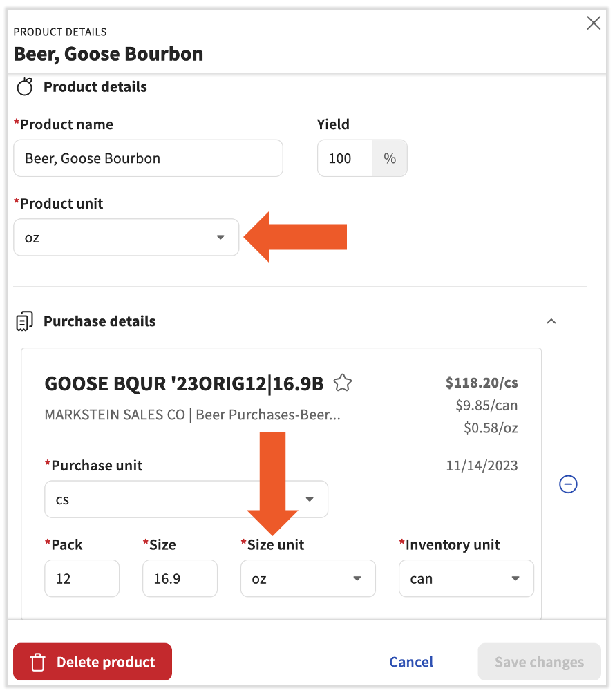 The Size unit needs to match the type of Product unit you just set. There are three types of Product units in xtraCHEF and each has several corresponding Size units: weight, volume, and each/count. For instance, if the Product unit is set to gram or lb, the Size unit must be a weighted measure as well.