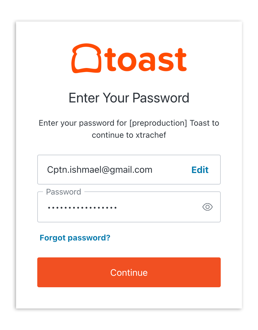 Toast will then log you out and ask that you log in with your new credentials. Enter your email address and the new password. Then select Continue.