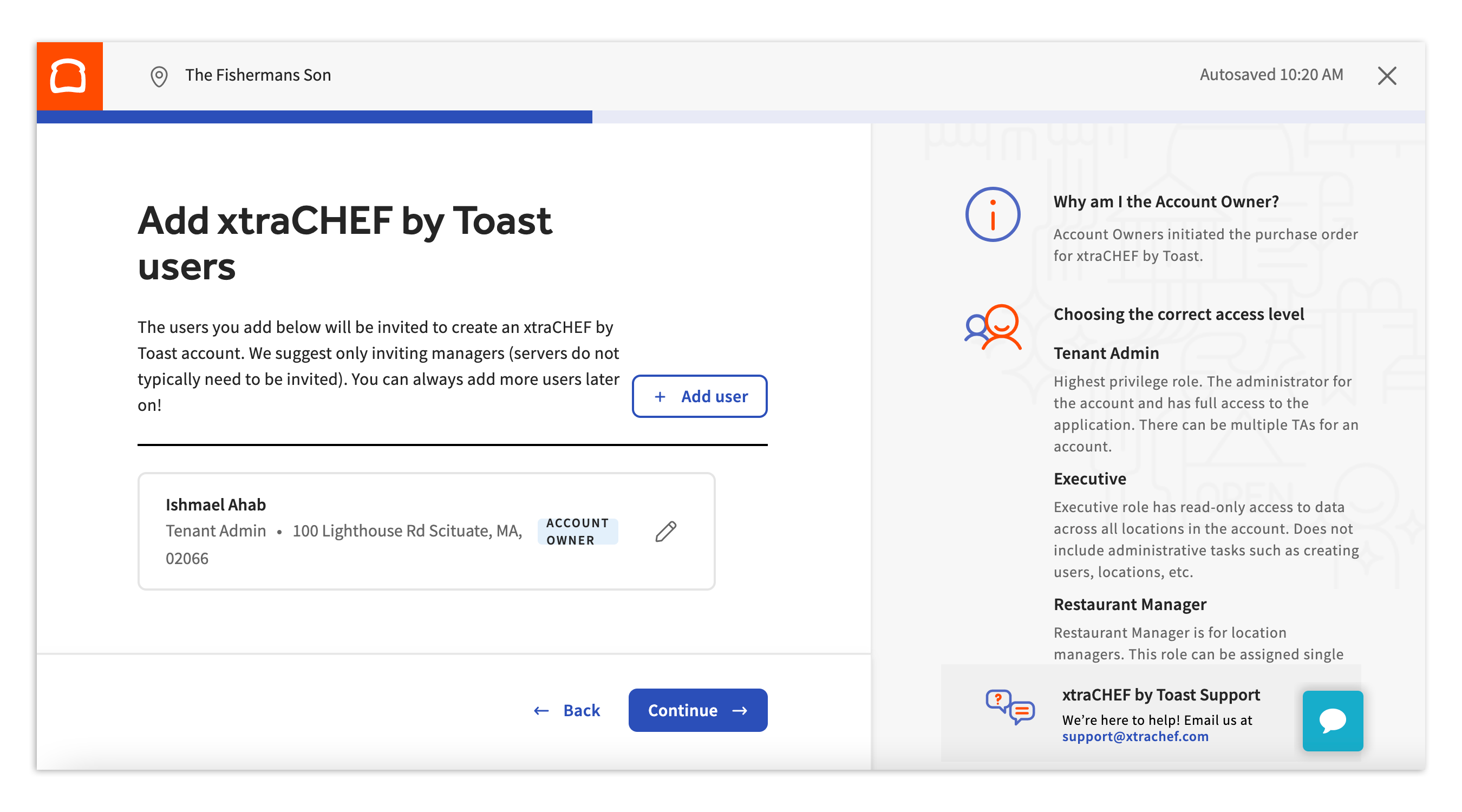 Select +Add user to add any additional users that require access to this system (this can also be done later). Required information is indicated by the red asterisks. A grants them access to specific parts and functions within xtraCHEF.