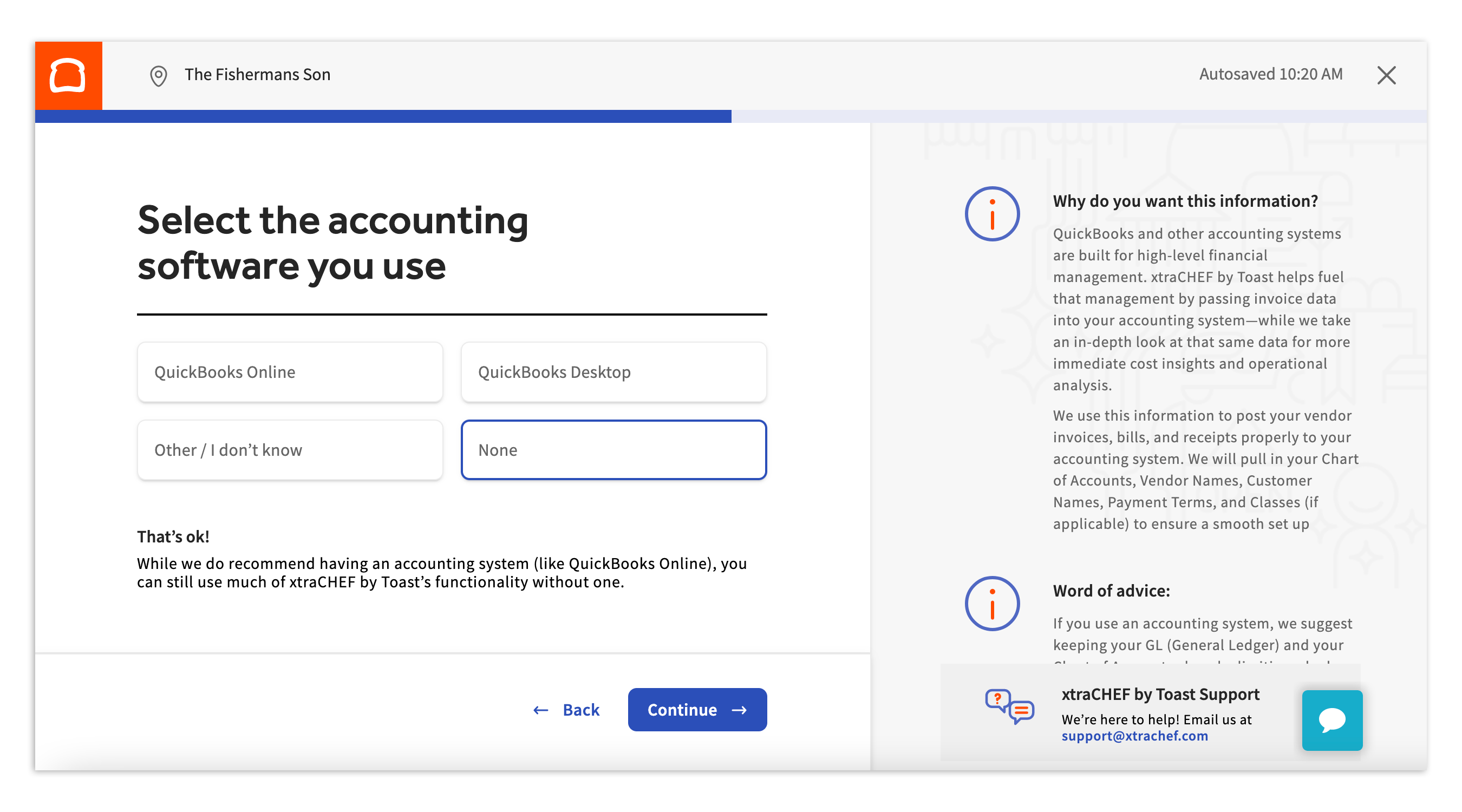 After users have been entered, the xtraCHEF self-onboarding module will prompt you to sync with your accounting software. Select from options such as QuickBooks Online, QuickBooks Desktop, Other/ I don't know, and None.