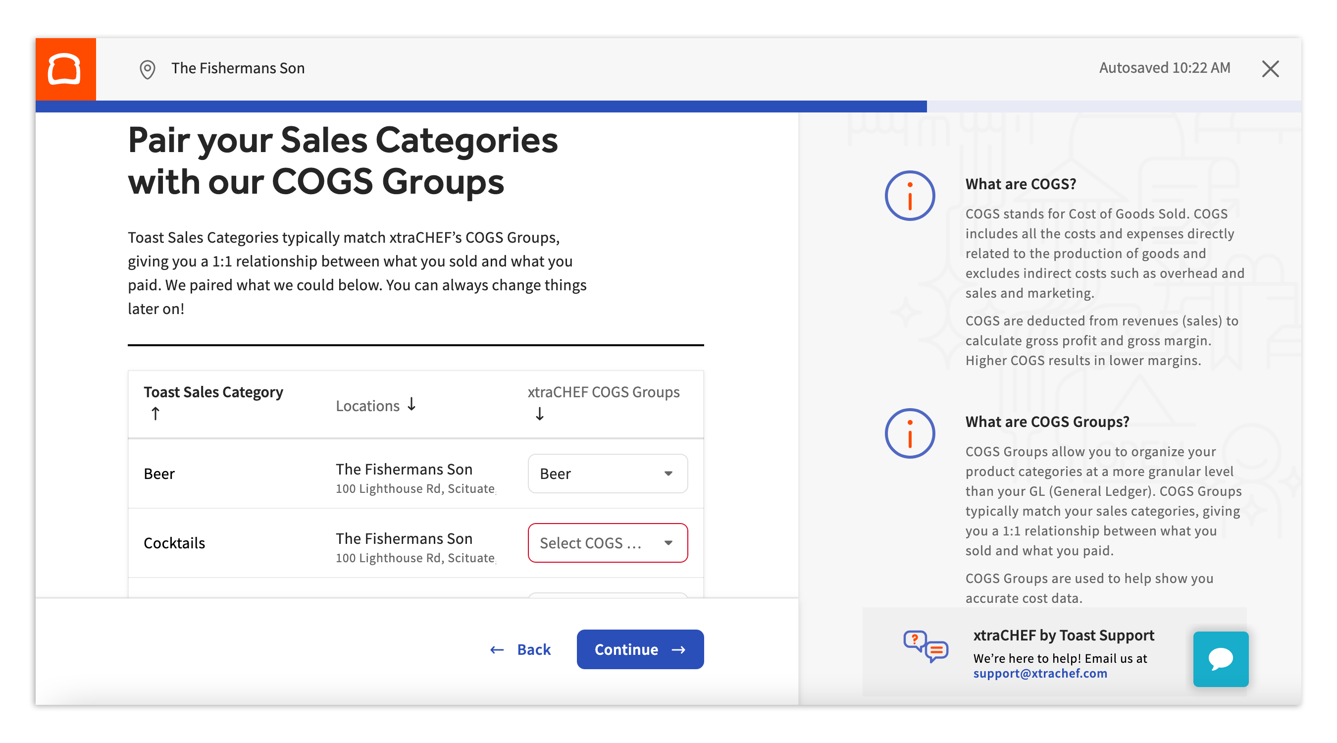 The next step asks you to match your Toast with your xtraCHEF . Multiple sales categories may fall into one COGS group. Keep in mind that you may change these settings after you finish the self-onboarding module.