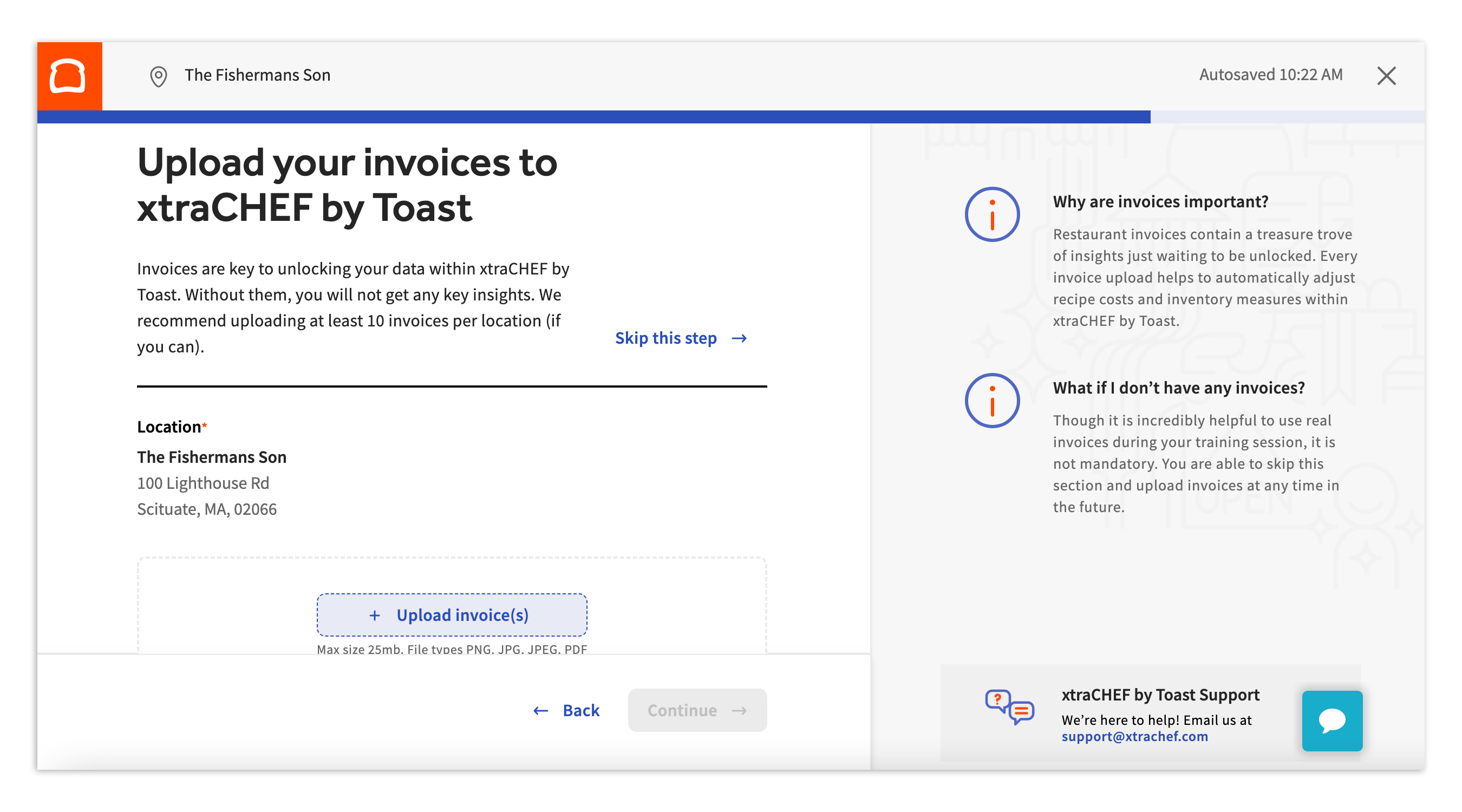 The last step asks you to upload recent invoices to the xtraCHEF system. These invoices will provide data for the system to start reporting on and also gives our AI tool a feel for how to read your invoices, making uploads faster as you continue to add more. It also makes your initial training easier. You may skip this step if necessary, but it is highly recommended.