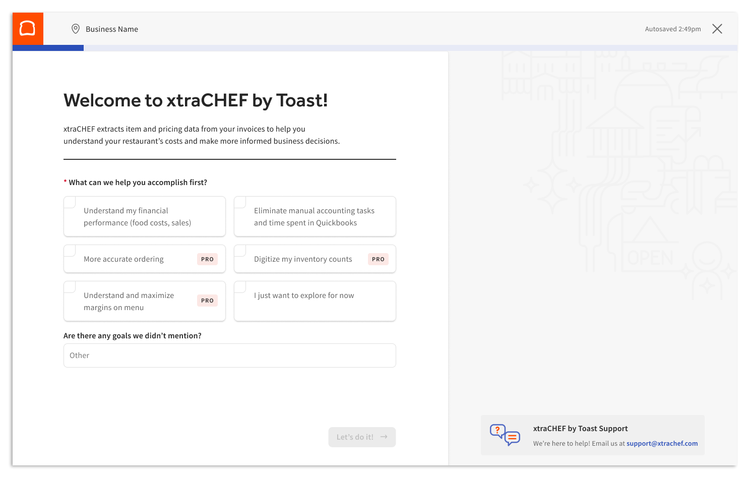 Next, you will see a welcome screen with a few questions on it. Selecting the options that are most applicable to you will help us understand your goals and priorities during your xtraCHEF Onboarding journey.