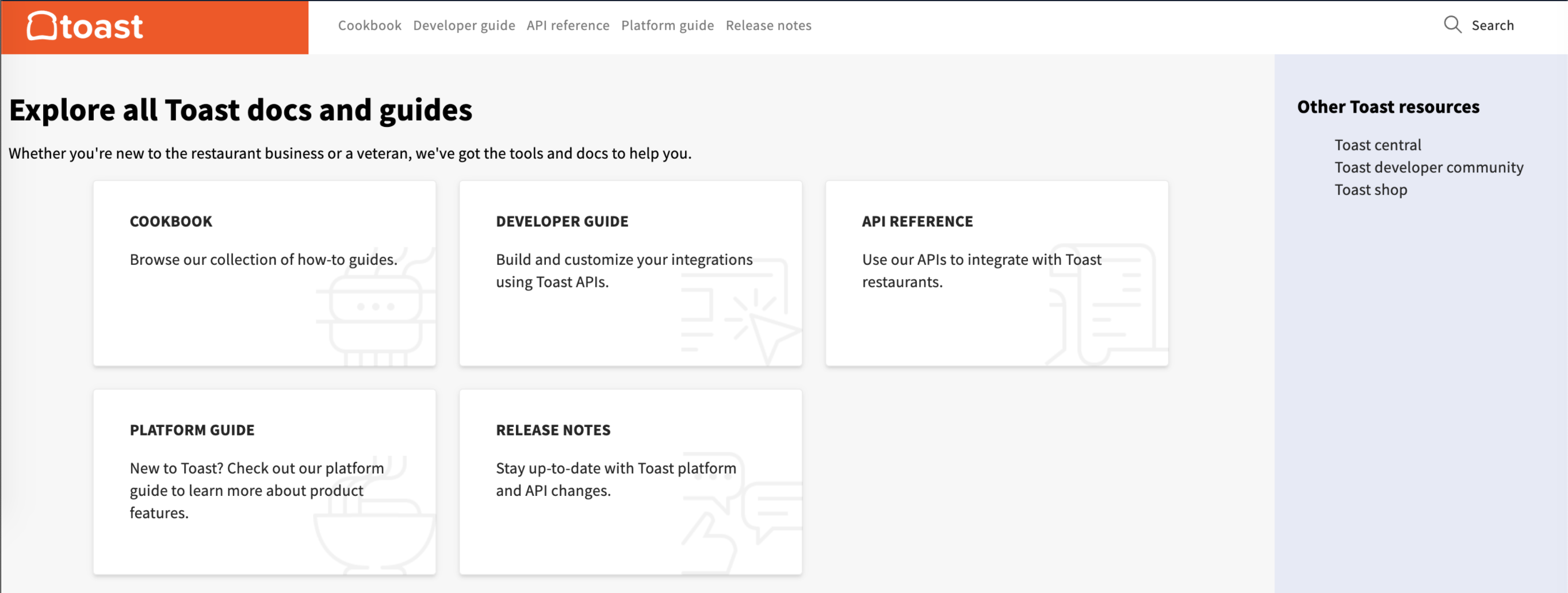 Tenemos un sitio de documentación para desarrolladores de integración. Este sitio cuenta con "libros de cocina" (guías prácticas) de desarrollo de integración. Echa un vistazo a este sitio aquí interfaz de programación de aplicaciones (API) de Toast