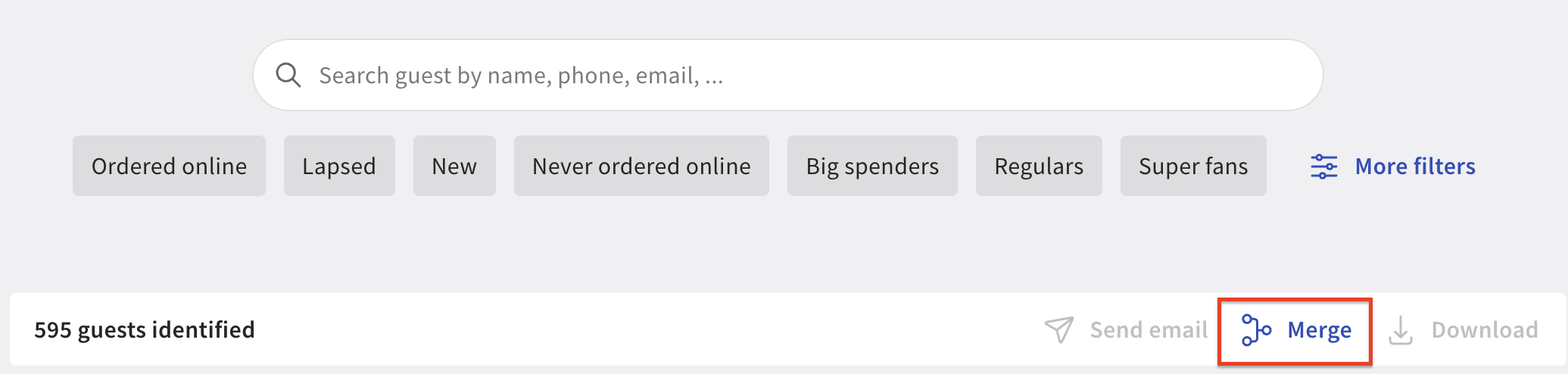 Nota: También puedes filtrar por ubicación y seleccionar una o más ubicaciones bajo el grupo de gestión del restaurante. Hacer esto mostrará todos los huéspedes que han visitado las ubicaciones seleccionadas al menos una vez y mostrará datos de pedidos agregados para las ubicaciones seleccionadas.
