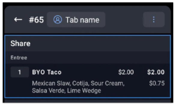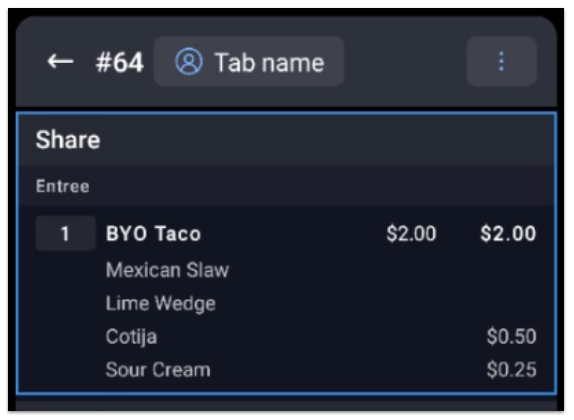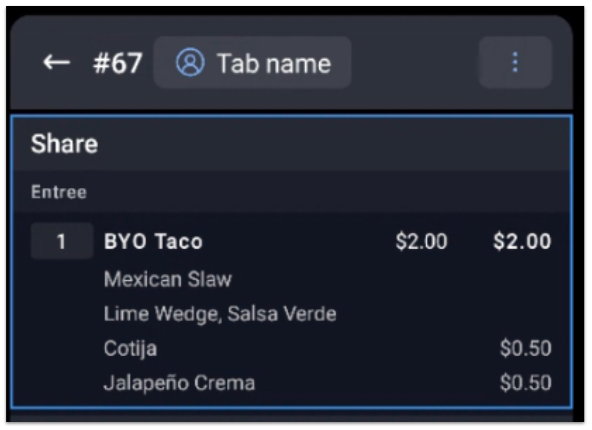 En el ejemplo anterior, en función de la secuencia de grupos de modificadores enumerados, el sistema se asegurará de que la opción Complementos de taco seleccionada por el personal esté siempre en la parte superior del pedido, seguida de la Elección lateral.