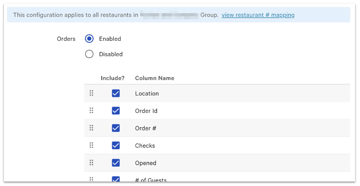 Una vez que hayas contactado a Toast Customer Care y ellos hayan configurado tu acceso, podrás habilitar y configurar los diferentes tipos de datos exportables. Puedes elegir el nombre y el orden de las columnas que te gustaría exportar. Este orden y selección permanecerán consistentes incluso cuando las columnas de informes predeterminadas en la web cambien con nuevas versiones de Toast.