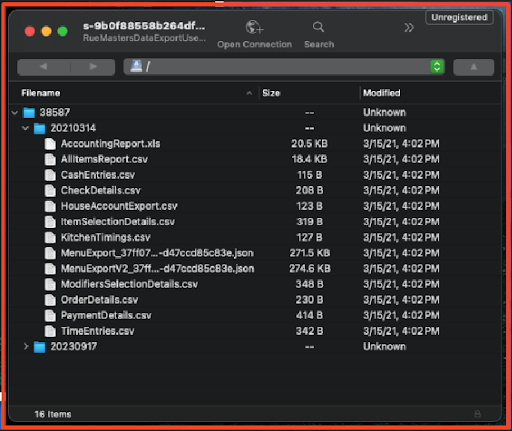 Si tu ubicación es parte de un grupo de múltiples ubicaciones dentro de Toast, las credenciales de inicio de sesión que proporciona Toast darán acceso a los datos exportados de todas las ubicaciones dentro del grupo. Cada ubicación tendrá su propia carpeta numerada. Puedes descargar un informe de tus Mapeos de Números de Restaurante después de iniciar sesión en .