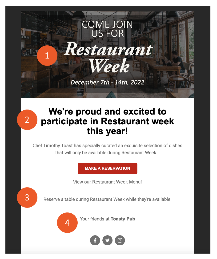 Usa un Diseño Amigable para Móviles: Mantén el cuerpo del correo electrónico conciso y evita bloques grandes de texto, especialmente considerando que muchos destinatarios ven correos electrónicos en dispositivos móviles. Incorpora imágenes de los elementos del menú para romper el texto y mejorar el atractivo visual.