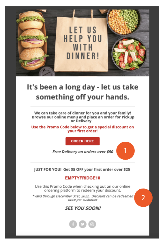 Tener un Llamado a la Acción Claro: Incluye un llamado a la acción claro y convincente que dirija a los destinatarios a realizar acciones deseadas, como visitar tu sitio web, hacer reservas o pedir en línea.