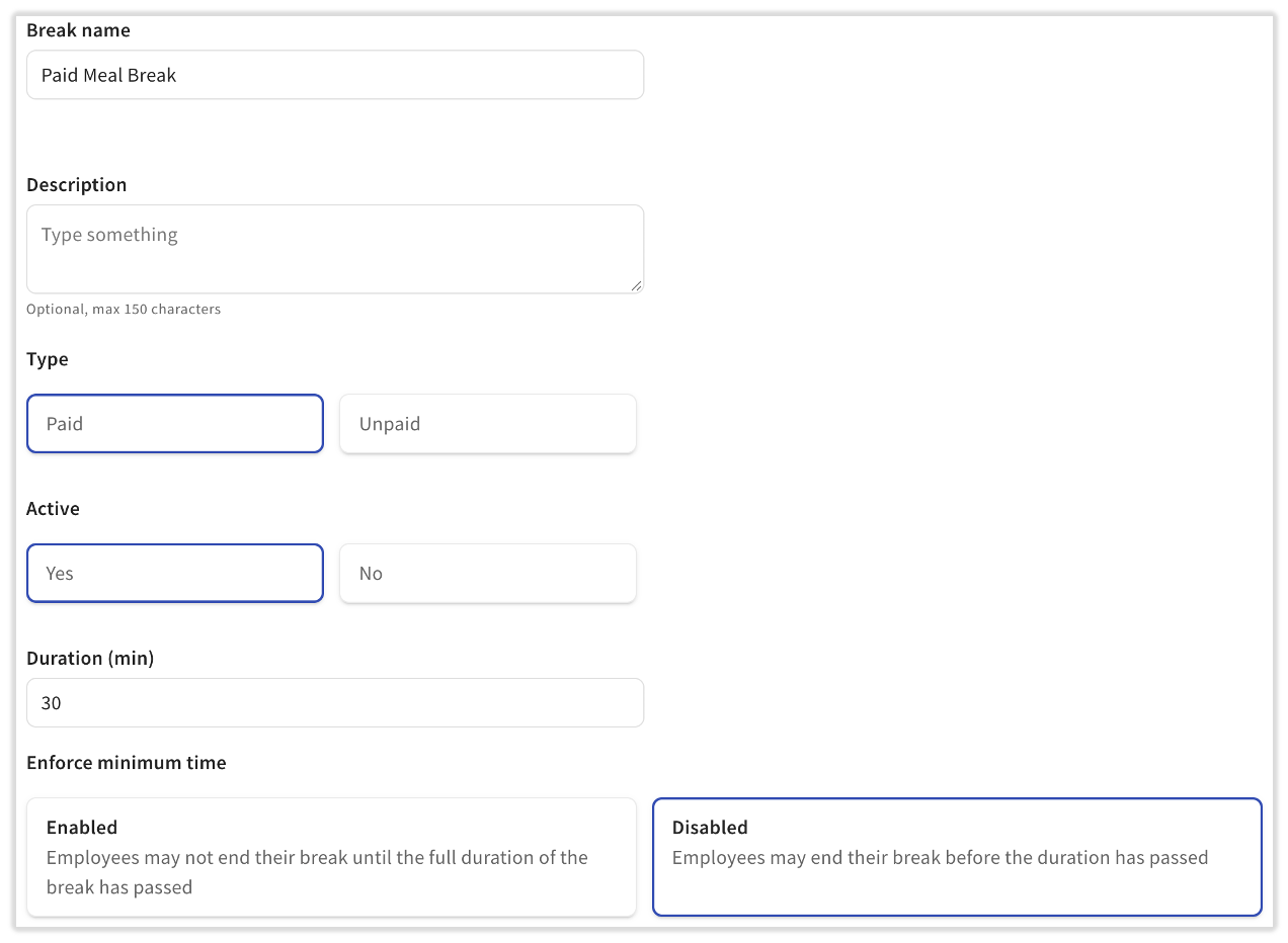 Si quieres que tus empleados tomen un descanso remunerado de 10 minutos cada cuatro horas, pero también quieres que solo sean elegibles para este descanso después de trabajar dos horas, la configuración de seguimiento de descansos podría configurarse como aparece en la captura de pantalla a continuación. Si se configura esta configuración, los empleados deberían comenzar su descanso cada 3 horas y 59 minutos de trabajo para que se registre como “tomado” en lugar de “no tomado”.