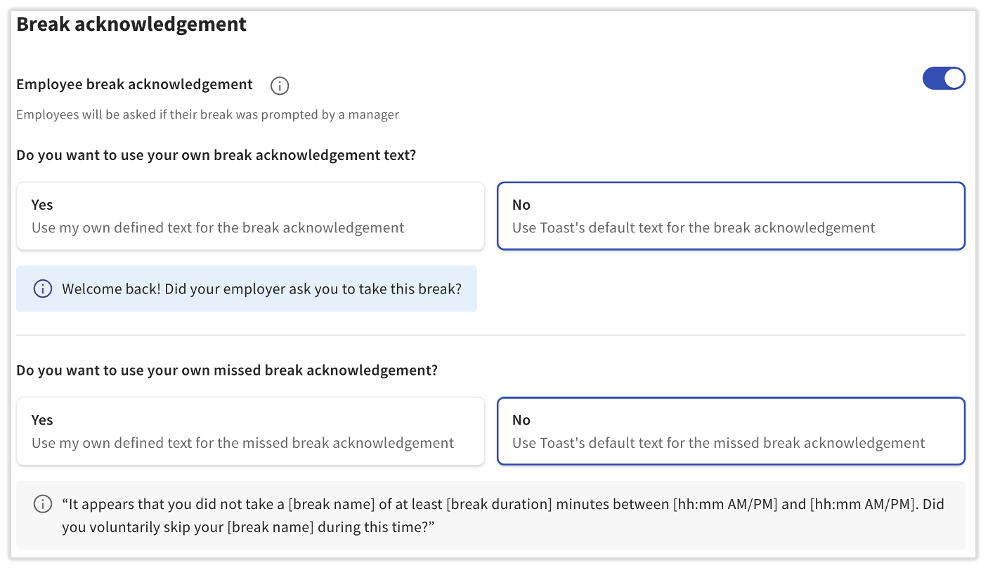 Cuando se active esta opción, los empleados verán un mensaje cuando registren su entrada después de un descanso, dependiendo de si observaron el descanso como obligatorio o se perdieron el descanso. Si un empleado está en un descanso y registra la salida (a través de la pantalla del reloj o una reseña del turno), seguirá viendo este mensaje, incluso si tiene el . No se puede editar una respuesta.