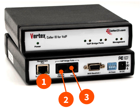 Toast recoge el ID de llamada a través de Ethernet, por lo que se deberá ejecutar la Herramienta de Configuración de Vertex para configurar la caja CID. Conecte el "Puerto de Gestión" de Vertex y su PC que ejecuta la Herramienta de Configuración de Vertex (VCT) al Router de Subred de Datos (Meraki o switch ubicado cerca de la caja de ID de llamada).