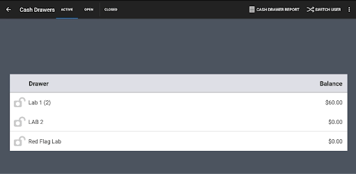 Un cajón de efectivo activo es utilizado por los empleados del restaurante para hacer entradas de efectivo. Puedes ver los cajones activos listados en la pantalla de Cajones de Efectivo en tu dispositivo Toast.