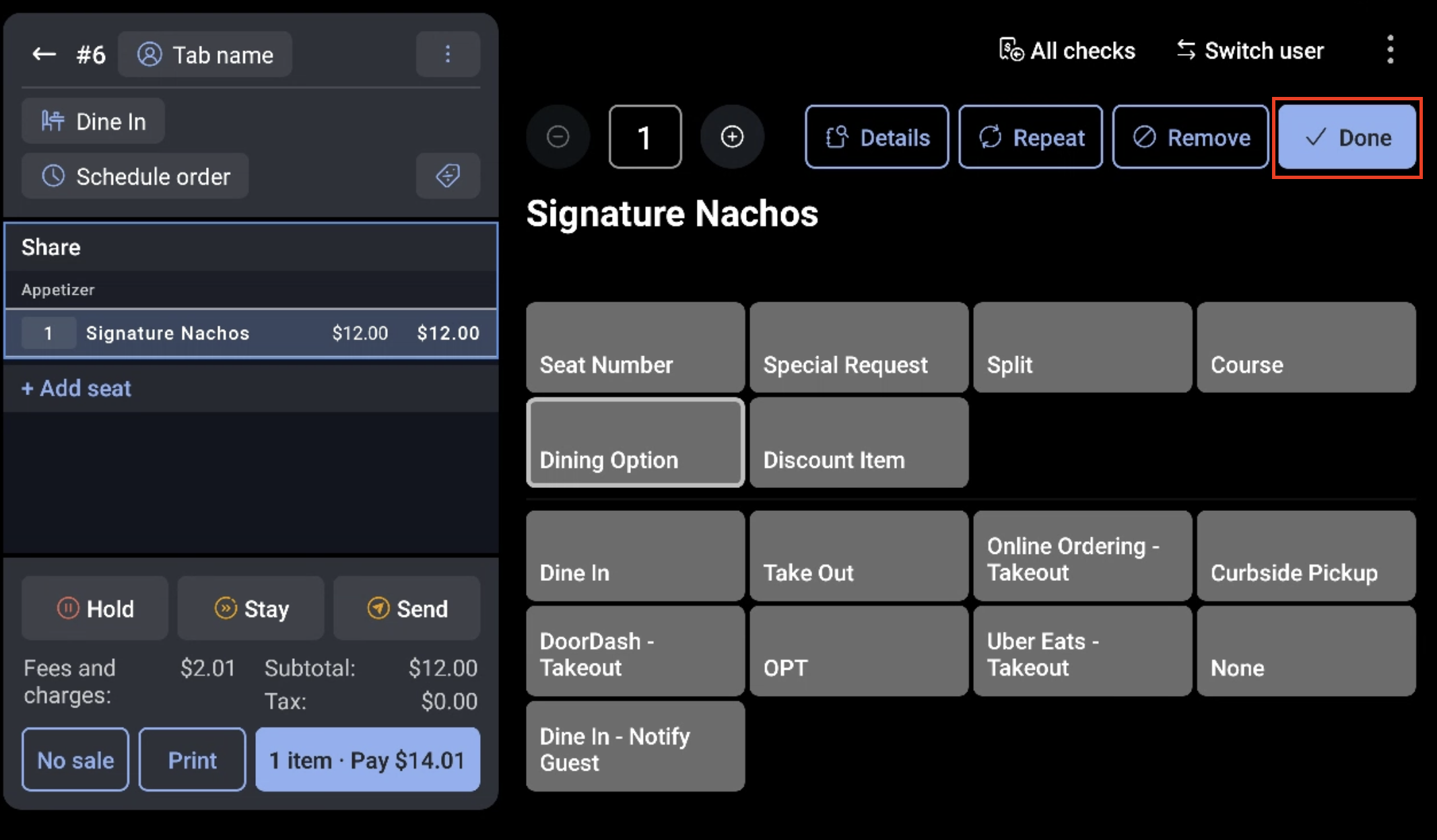 Para cambiar la opción de almuerzo/cena de un solo artículo, sigue estos pasos: Cambiar la opción de almuerzo/cena para toda la cuenta o Ticket hará que el número de mesa en el Ticket desaparezca, por lo que recomendamos seguir estos pasos en su lugar.